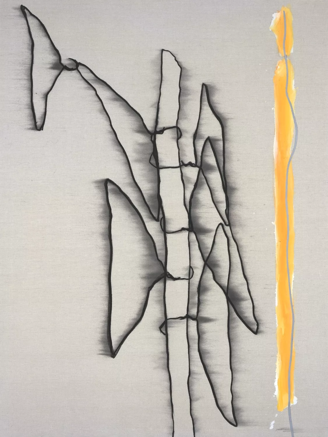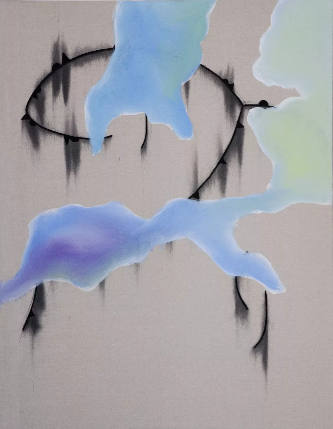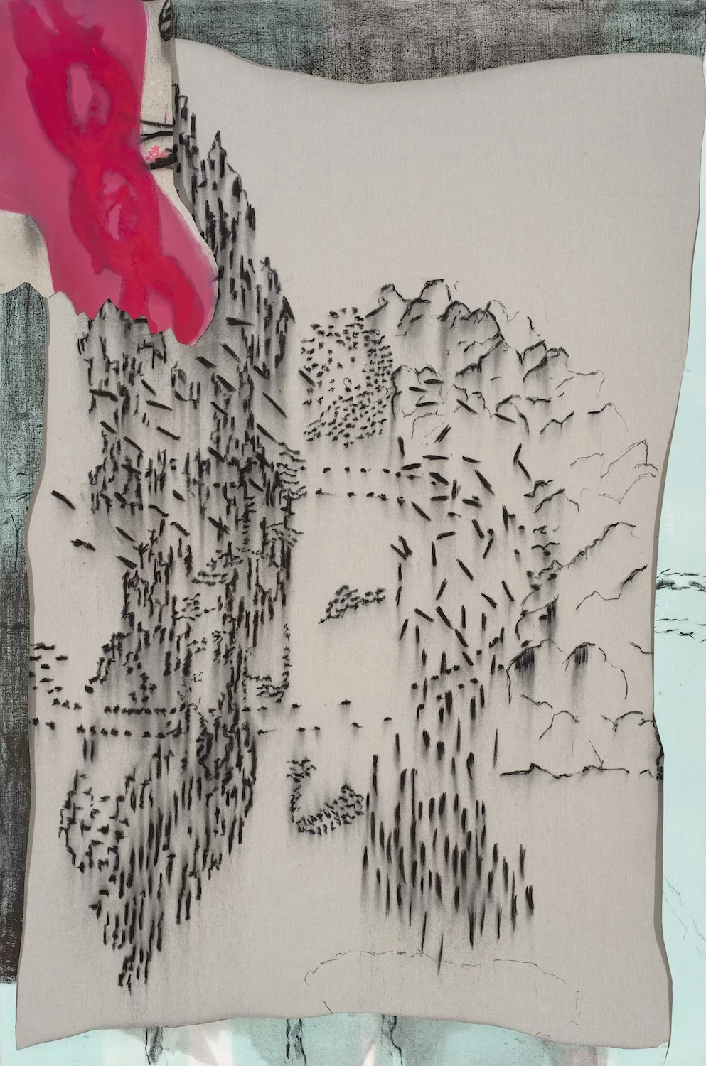 L’un des autres principes fondateurs de sa création est ce qu’elle nomme la dé-liaison, quand les éléments perdent leur ancrage aux autres, quand la couleur se décale du trait et que les plans se disloquent et perdent toute échelle et mesure. Et l’idée de la strate qui, en reprenant des toiles déjà peintes, deviennent le soubassement d’une création originale. Les peintures sont partiellement recouvertes de fragments de toile ancienne monochrome et donnent à voir un assemblage d’images constitué de dessins, de peinture et de champs colorés découpés.