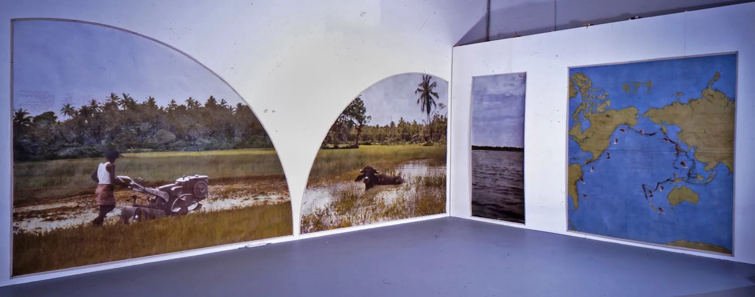 Avec leur première grande œuvre, The Lagoon Cycle (1974-1984), une fresque aussi spectaculaire en taille – plus de 49 mètres de long en 60 sections – qu’en données combinées, la mécanique de travail s’est instituée entre les deux artistes. Endossant le rôle du « Witness », H. Mayer Harrison dialogue avec le « Lagoon Maker » (N. Harrison), rédigeant sept chapitres au fil desquels, dans une écriture bouclée lisible dans l’installation, se déploie l’histoire du Scylla serrata, un crabe du Sri Lanka. Illustrée de collages photographiques et de textes manuscrits (l’apport de H. Mayer Harrison) ainsi que de cartographies et de dessins, cette analyse écosystémique des mangroves présente autant les moyens techniques de l’élevage en pisciculture de ce crabe de boue qu’une critique des stratégies géopolitiques et postcoloniales sous-jacentes. Montrée pour la dernière fois à Paris en 1996 dans l’exposition Villette-Amazone avant son entrée dans les collections du MNAM-Centre Pompidou, cette « Sixtine » de l’art écologique constitue le parangon de la collaboration entre les Harrison.