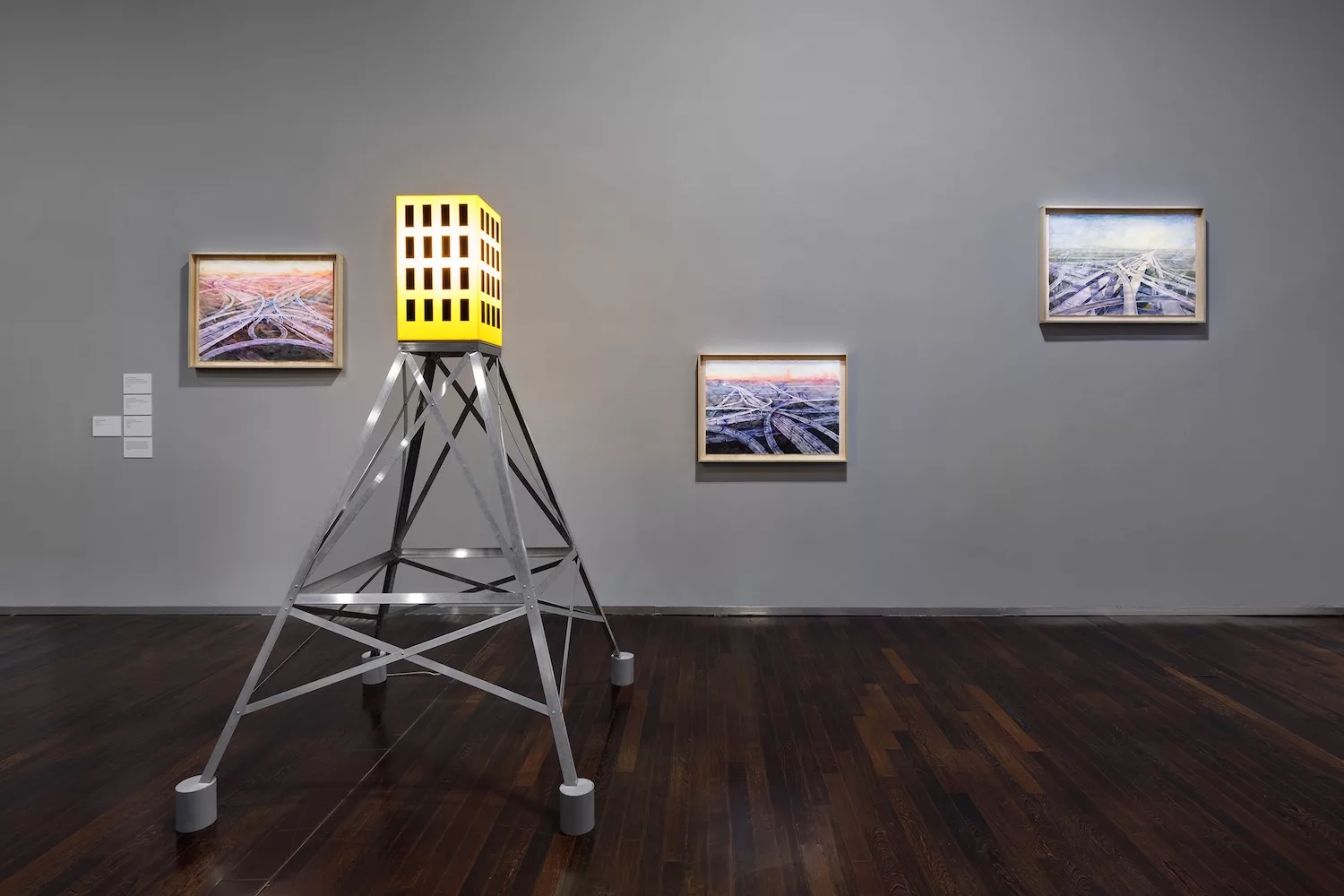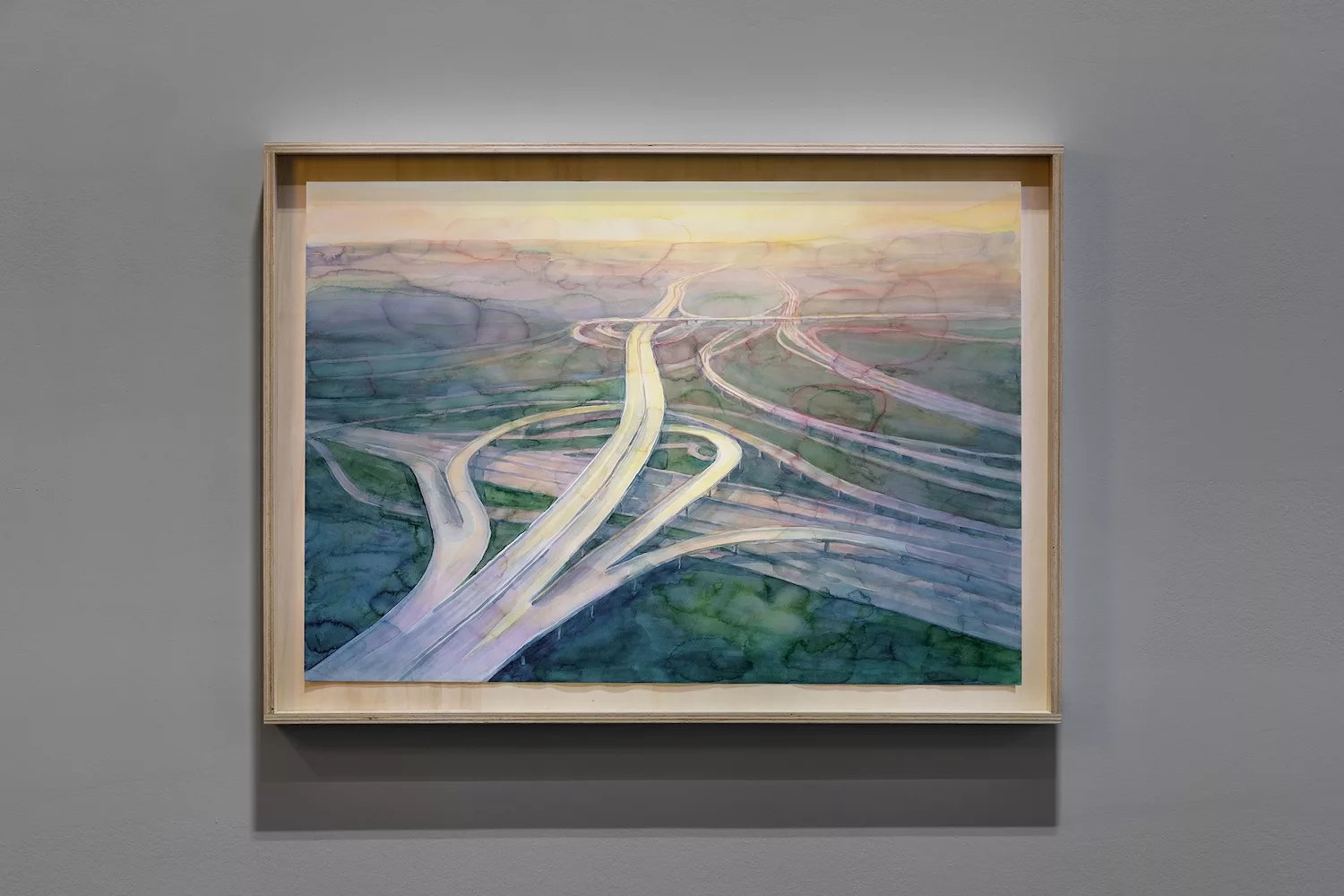 Dès ses débuts, K. Solomoukha fait de la ville un lieu de réflexion. Dans ses installations Projet/Cinéma (1998) et Shedding Identity (2006), la lumière et les fragments du tissu urbain deviennent des métaphores des relations changeantes entre l’espace, la mémoire et l’identité. Son exposition Pastime Paradise (PinchukArtCentre, Kyiv, 2008) dissèque avec humour les imaginaires urbains post-soviétiques, imprégnés de nostalgie, de kitsch et d’utopie. Sa fascination pour les espaces liminaires et suspendus s’exprime dans ses expositions solo Stoptime Hotel (Fundació La Caixa, Barcelone, 2006) et 3 305,74 TTC (Le Dojo, Nice, 2009), qui évoquent des visions abandonnées du progrès. Ses aquarelles, de Geography of Nowhere (2006) à Dancing at the Edge of the World (2024), prolongent cette réflexion en dissolvant les échangeurs d’autoroute en paysages post-humains et spéculatifs.