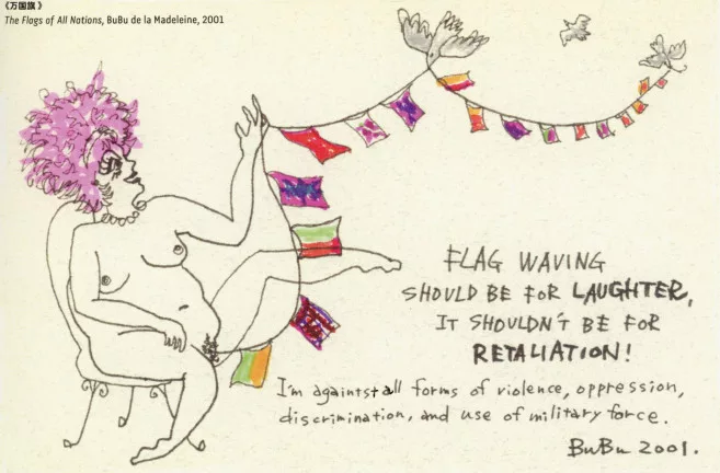 ブブ・ド・ラ・マドレーヌに名声をもたらしたのは、1994年から1996年にかけて15カ国20都市を巡回したダムタイプのパフォーマンス作品《S/N》だ。とくに注目すべきは、《S/N》の最後のシーンでのブブである。ナナ・ムスクーリの『アマポーラ』の甘いメロディーが流れるなか、全裸で椅子にゆったりと座ったブブは、舞台上をゆっくりと右から左へと移動しながら、わずかに照らされた股間から万国旗を引き出していった。そのひとつ前の「ラブソング」というシーンでは、ブブは、以前結婚していた時期の自身の性生活について、さらに、セックスワーカーと教育者という《S/N》ツアー当時の職業について、異性愛女性の立場から、ピーター・ゴライトリーと古橋悌二を相手におしゃべりをした。そのブブの胸元から頭までは大きなスクリーンの右半分に映し出されており、観客は、念入りに化粧をほどこし、露出度の高い黒いシュミーズを着た彼女の姿を見ながら話を聞くことになった。一方、画面の左半分には、スクリーンも兼ねた構造物の上に置かれた机の前に座る古橋悌二の顔のクロースアップが映し出された。古橋は、ドラァグ・クイーンに変身する化粧をしながら、HIV陽性のゲイ男性としての自らの人生について語ったのだった。