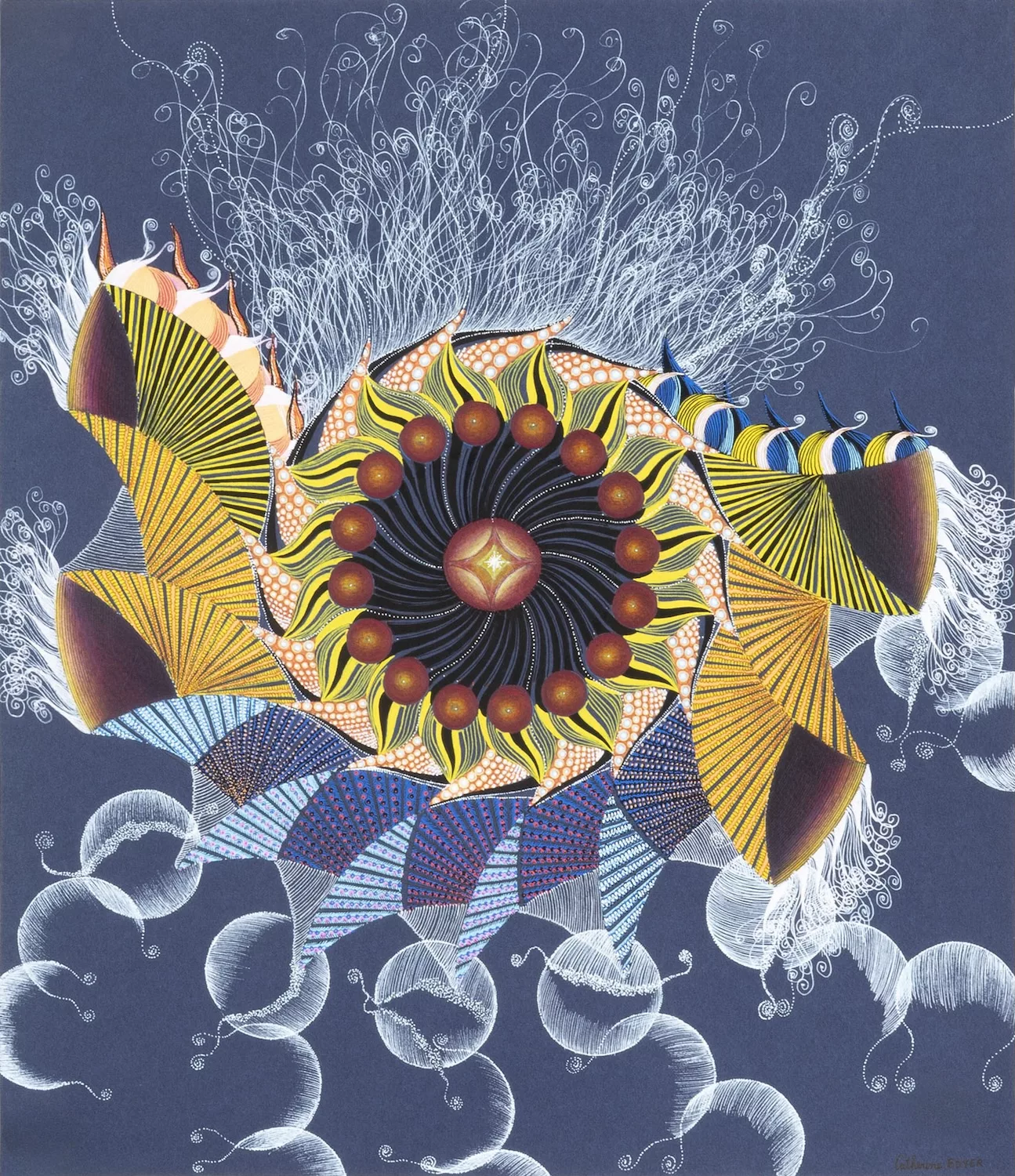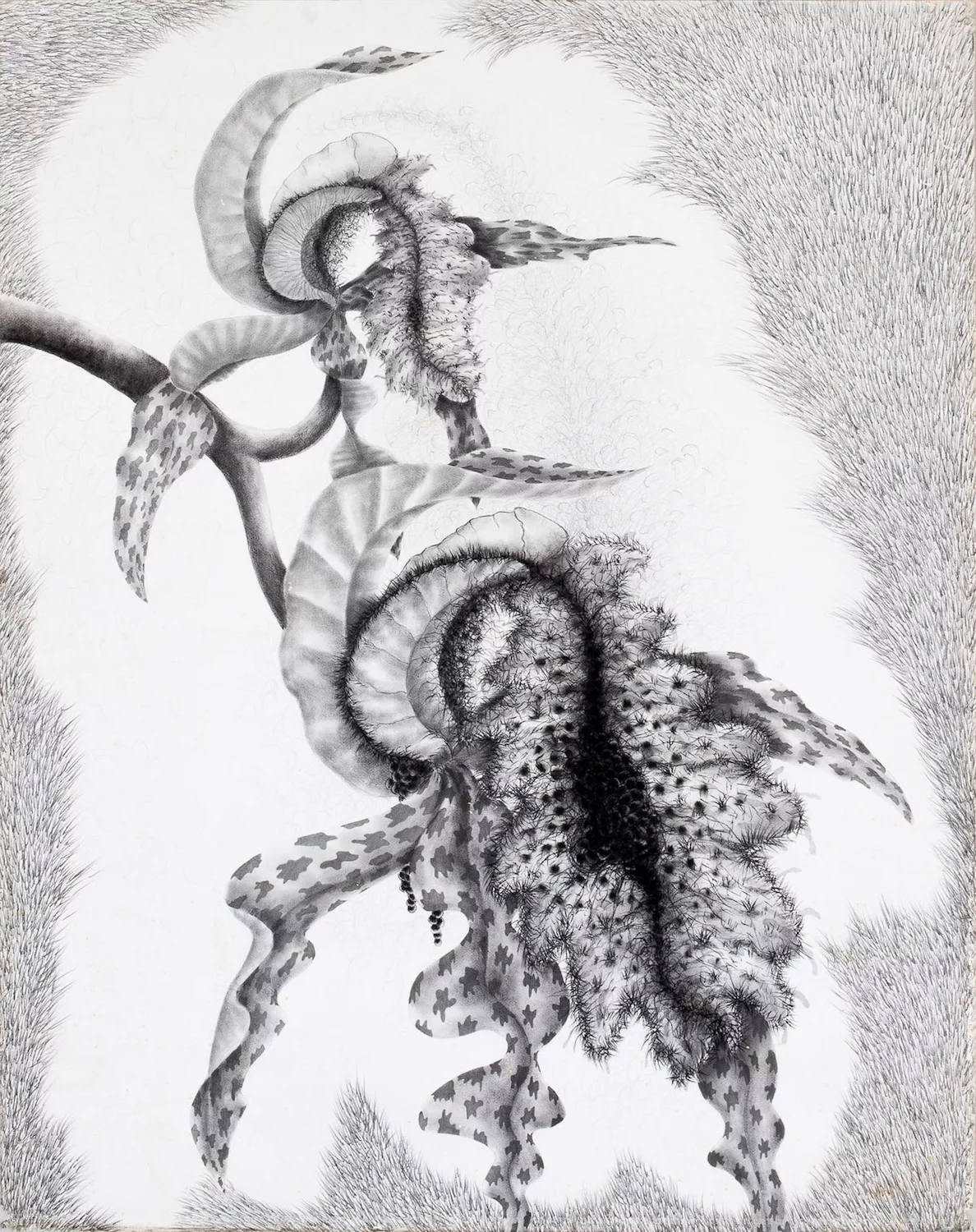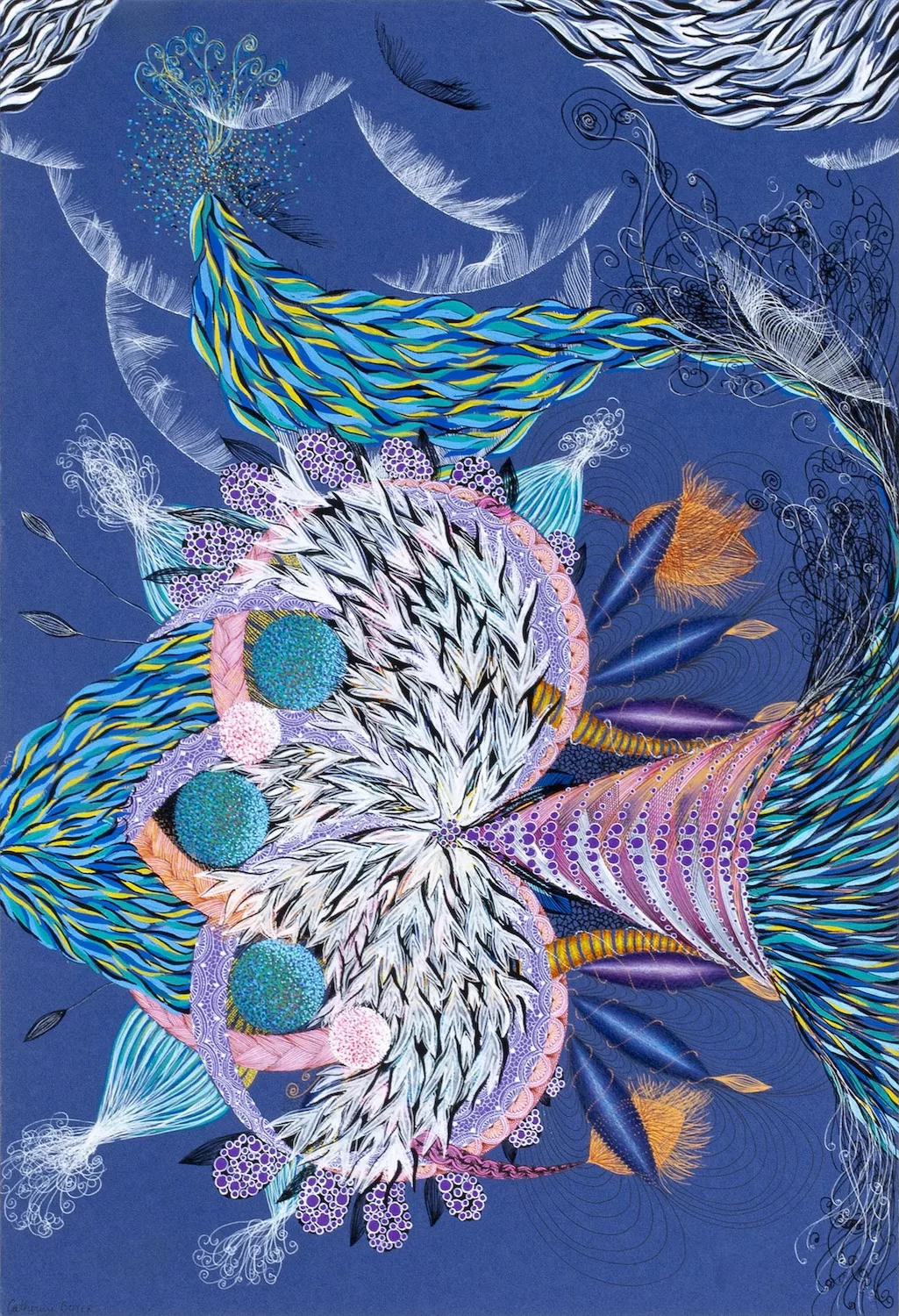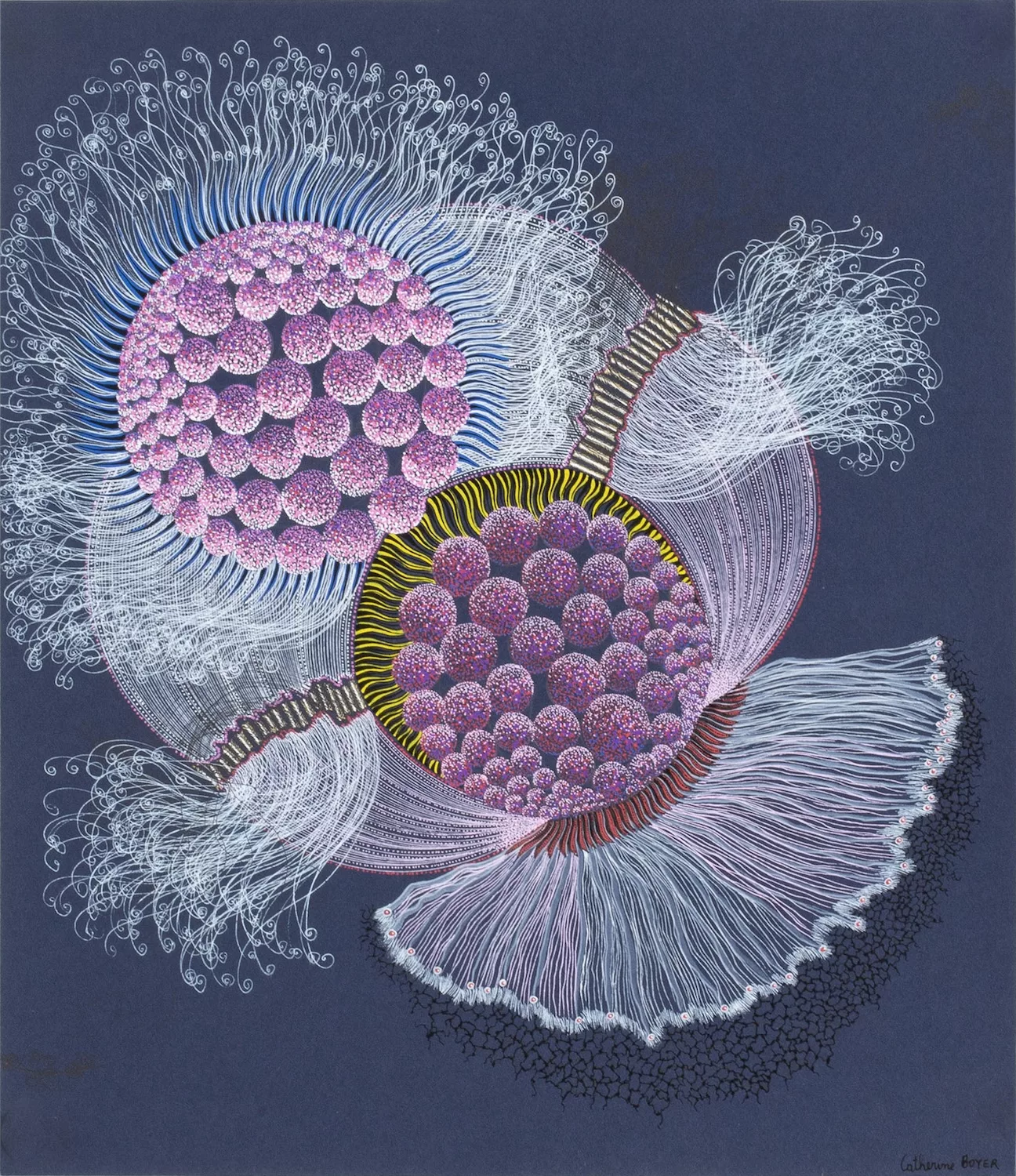 “Being a woman is an intimately painful experience”, says C. Boyer. We feel this pain in both our flesh and our stories. Intrusions, inflammations, tears, sutures, flows and fluids thus punctuate the artist’s depictions of figures, behind a certain gentleness and beauty that her gestures seem to call forth as if to more fully heal them. She includes motifs of wild flora and fauna in Les Orchidées and Les Papillons (two series begun in the early 2000s) and in the Luminescences series (2009–2010); evidence of hands interacting with matter are depicted in the Hair Tresse (2013–2020) and Divineariane (2021) series; and in Magic Wik (2022) and her mandala-inspired series Cymatique (2024–2025), she chooses increasingly hybrid, almost psychedelic forms. These meditative and somewhat restorative gestures give rise to suggestive, erotic or even chimerical figures. A quest for symbiosis seems to be at work here.