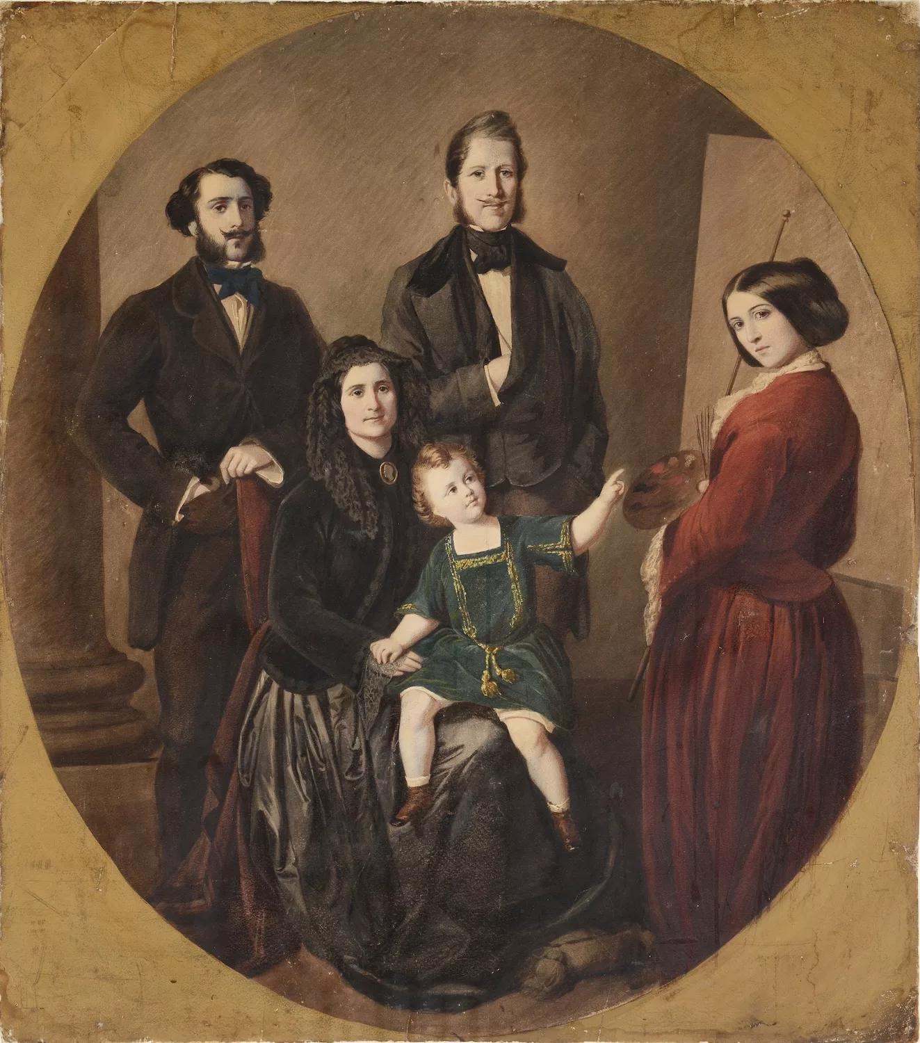 Despite her years abroad, E. Gaggiotti remained closely tied to Rome. In 1853, the writer Quirino Leoni mentioned a Portrait of the Gaggiotti Family that she had sent to a friend in the city, a gesture of affection and connection to her roots, as it seems to suggest the choice of colors for the national flag in the clothing of the effigies (Rome, Museo di Roma, Gabinetto delle Stampe, MR 45594). She resided on Via Gregoriana in the early 1870s, and was admired in both artistic and literary circles – as evidenced by poems dedicated to her by Q. Leoni in 1855 and Giuseppe Gioachino Belli.