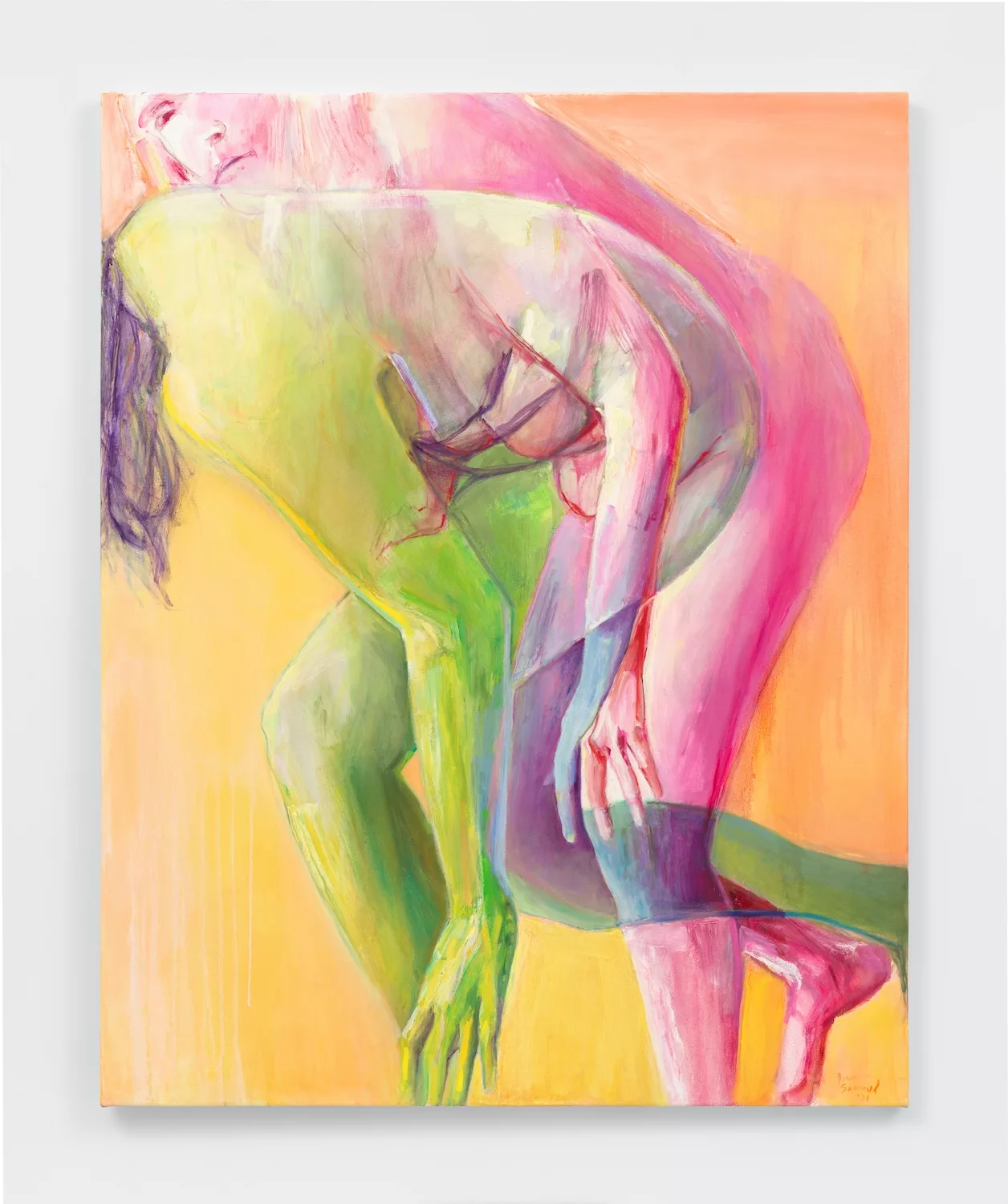 J. Semmel’s Locker-Room series (1988–91) brought the theme of aging to the forefront of her work, using source photographs taken at the gym that captured women in mirror reflections. She continued to confront social perceptions of aging and beauty in her With Camera series (2001–06). In Recline (2005), for example, the artist holds a camera pointing directly back at the viewer, registering their gaze. Her later work represents aging as an embodied yet potentially alienating experience. She transitioned from a naturalistic palette to return to bold, vibrant colours in works like Pink Lean (2019) and Morphing (2022). These large-scale paintings vividly display the taboo subject of older bodies, expressively and sensually painted in the flesh.