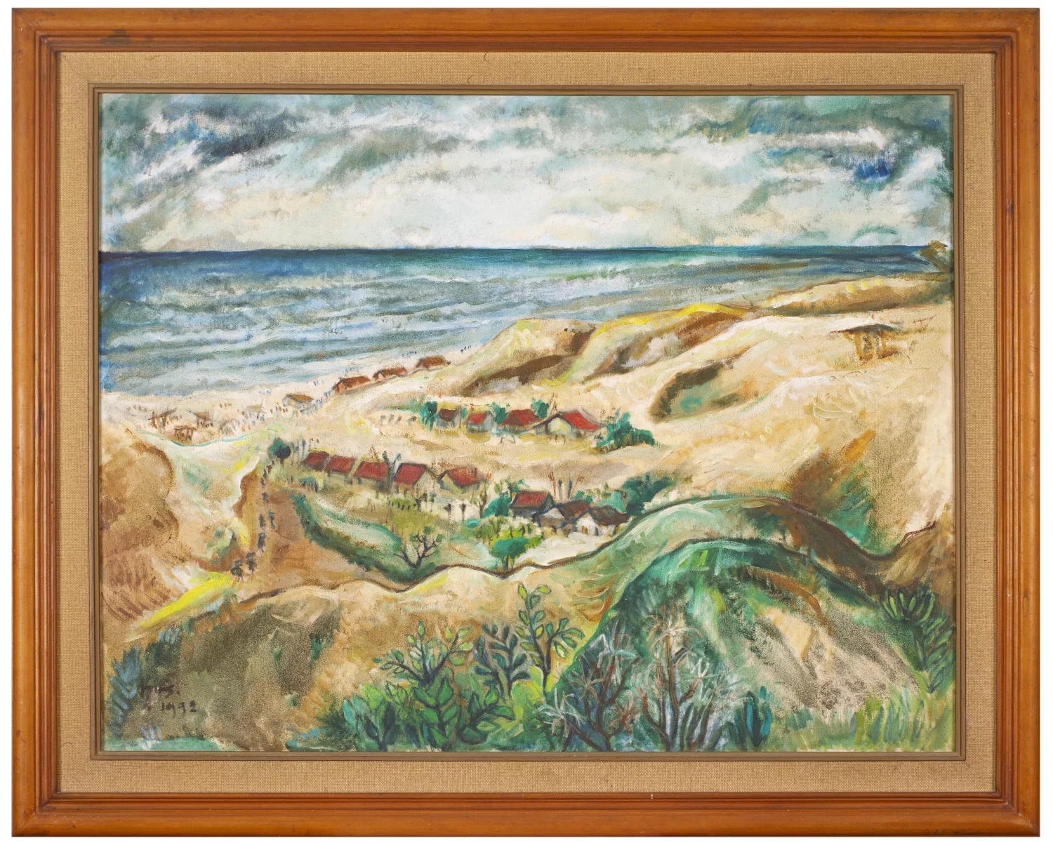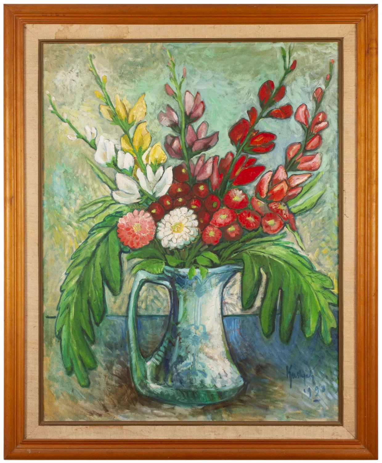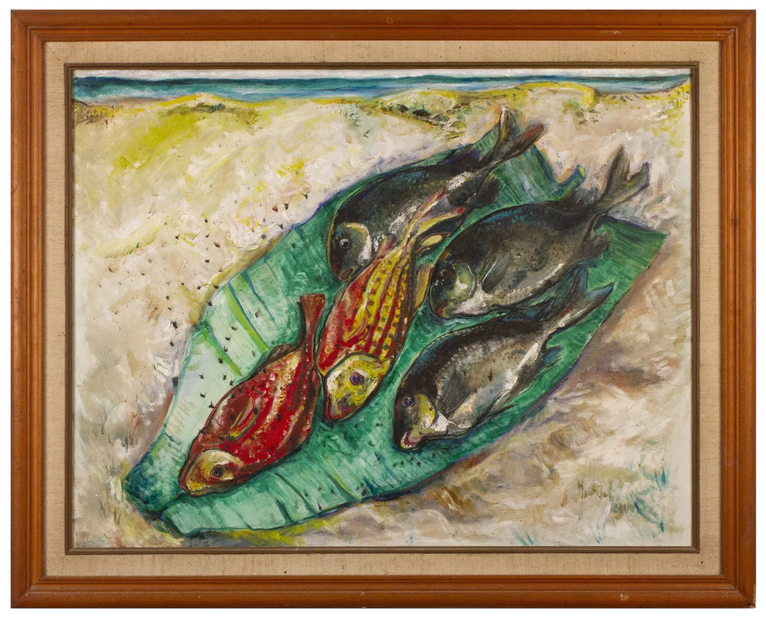 Kustiyah worked with oil paint throughout her life. Although works in other mediums, such as pencil and ink drawings, woodcuts and clay sculptures are recorded, so far these appear to have been limited to her student years. Over the decades, her palette grew gradually brighter, her brushstrokes lighter and her canvases more spacious. Despite this stylistic shift, her subject matter remained grounded in the same surroundings: fruits, flowers, the sea harvest and familiar landscapes such as beaches and rice fields. Baronang [2000], depicting a fish on a banana leaf paired with the landscape of Parangtritis Beach, demonstrates a unique blend of still life and landscape. Judging from the unusual composition – with the horizon line of the beach pressed close to the upper edge of the canvas, and the fish appearing almost pasted onto the sand – it is possible that this landscape was drawn from memory, illustrating her tendency to repeat motifs across decades and her longing to remain close to nature.