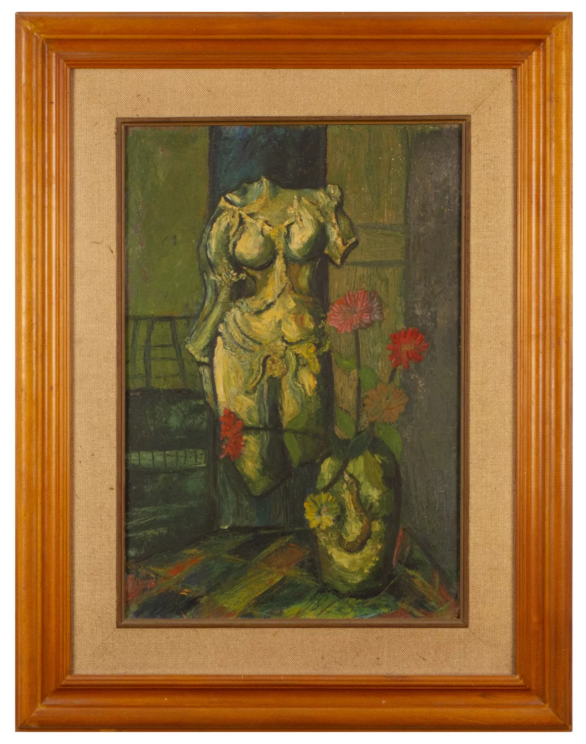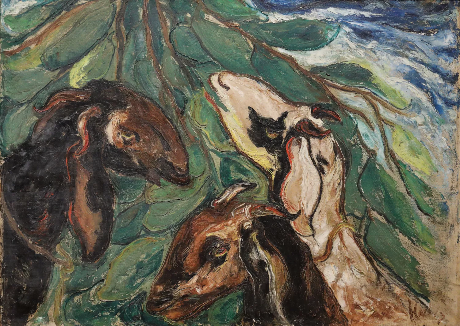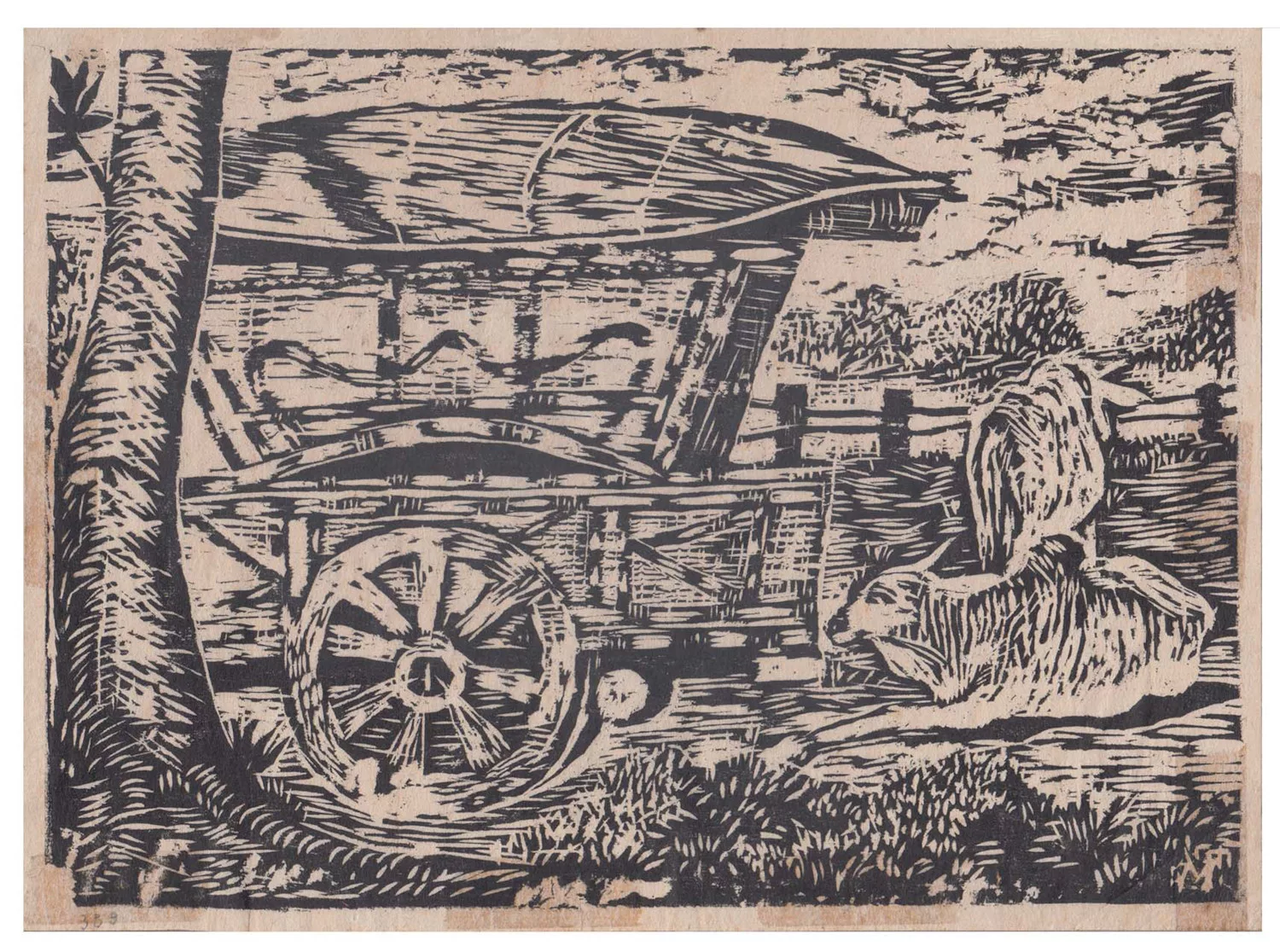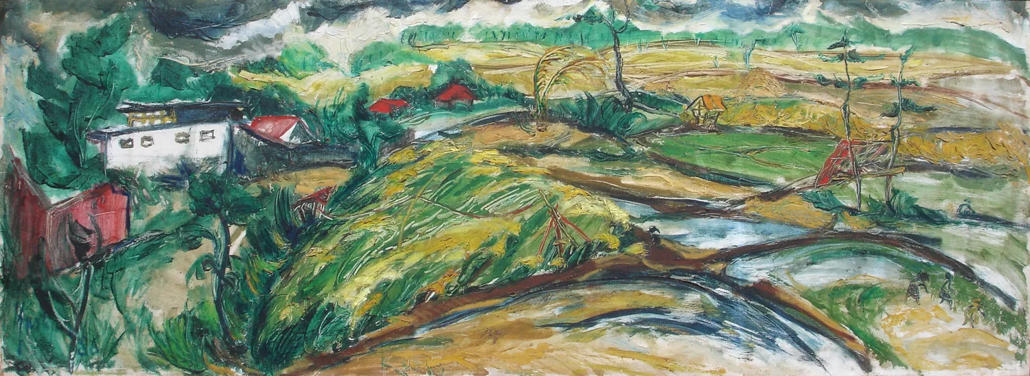 In 1953 Kustiyah moved to Yogyakarta, on her own, to study painting at ASRI [the Indonesian Visual Art Academy]. Alongside her formal studies, she was involved in artist groups such as Pelukis Rakyat [People’s Artists] and Pelukis Indonesia [Indonesian Painters]. Her early paintings reflected both her surroundings and her education, marked by sharp lines, heavy brushwork, dark colours and subject matter drawn from everyday life. These include Kampung [Village, 1960], which depicts the village where she once lived, and Kamboja Merah [Red Frangipani, 1969], showing a frangipani tree blossoming under the blazing sun. Kustiyah often worked on these paintings in the open air, either in the vicinity of her home or during her travels, often accompanied by family and friends. A photo of her painting a boat on a beach in Tegal appeared in Siasat magazine in 1956, capturing her practice of working outdoors.