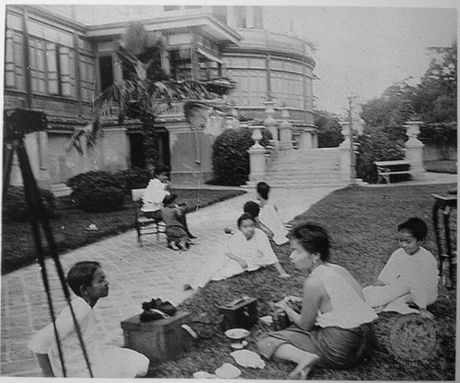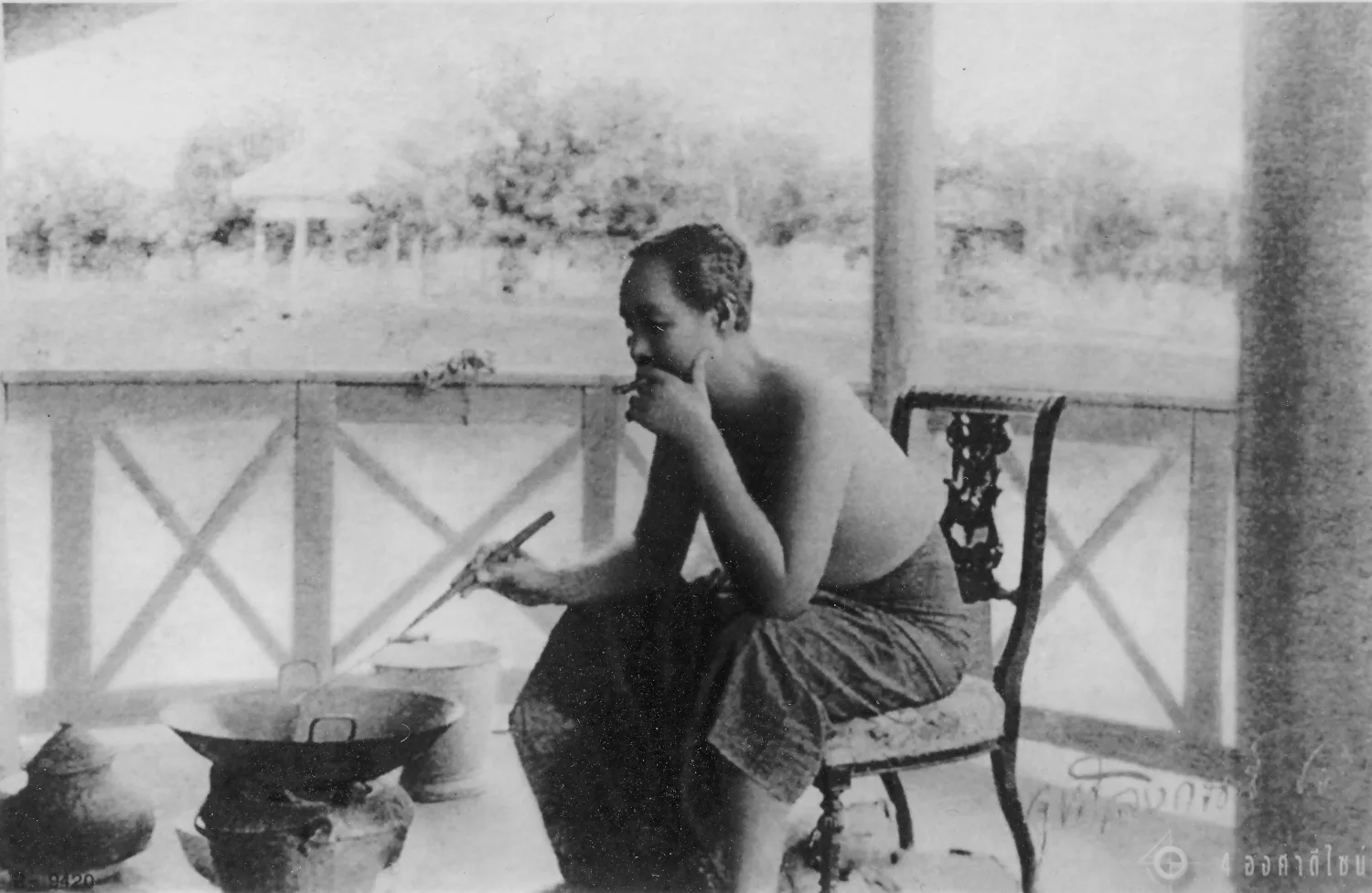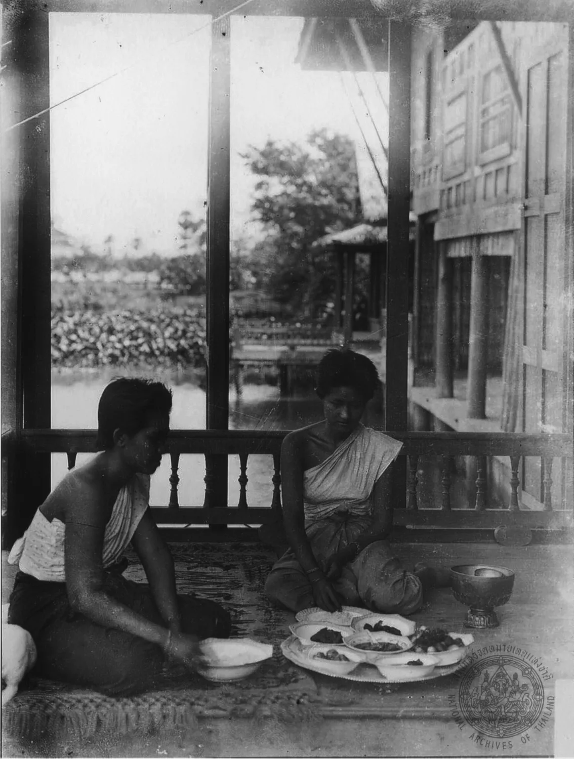 E. Bunnag photographed many scenes of domestic life in the palace, providing the best visual record of royal women’s lives during this period in Thai history. Her most famous image was her informal portrait of King Chulalongkorn himself enjoying a rare moment of leisure, shirtless and wearing only a pha khao ma as he stirs a wok and smokes a cigar on the porch of his rustic ‘Wooden House’ palace residence. Despite the fact that E. Bunnag’s images were never commercially published, this image has managed to enter global circulation, as Thai restaurateurs around the world frequently include it in their shop’s spirit shrine, where images of the Thai royal family are placed alongside Buddha images.