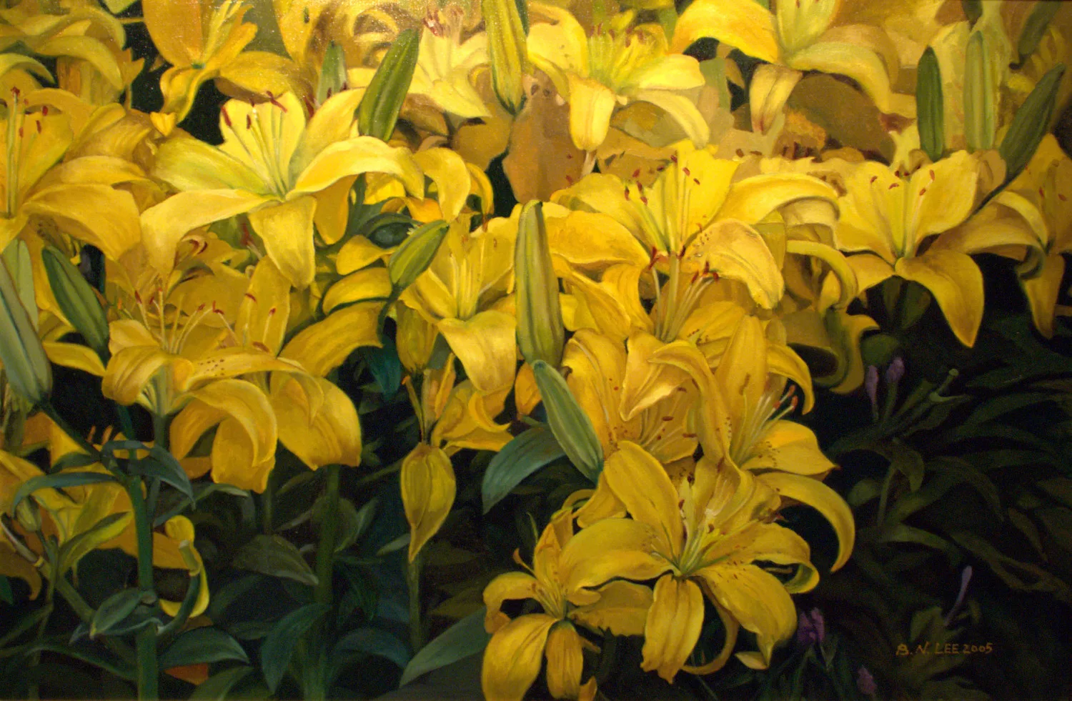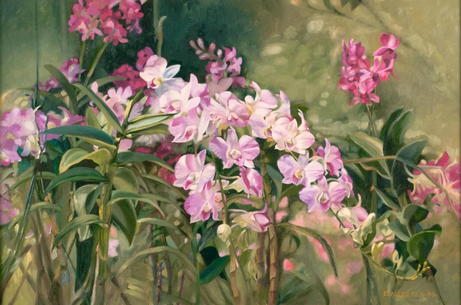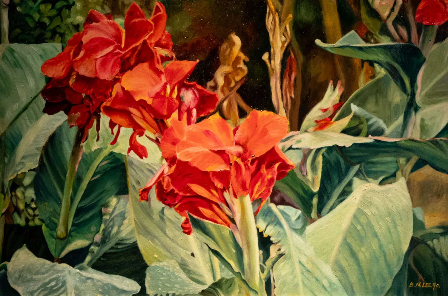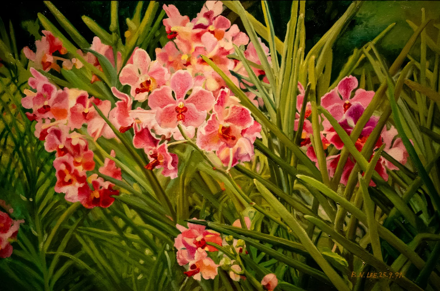 Lee began to push the boundaries of the Still Life genre, finding traditional frameworks increasingly limiting. Her paintings expanded dramatically in scale and ambition, with works like National Flower (1989) and Canna (1990), which are almost a metre long. She gradually experimented with a different style, highlighting a few flowers and blending the rest of the bouquet with the surroundings into an impressionistic mix of colours. Her painting Dendrobium (1987) exemplifies this innovation: the cascading orchids dominate the entire canvas in an outdoor setting, with the traditional table removed entirely. Lee maintained compositional coherence by juxtaposing different painterly approaches – rendering foreground flowers with high realism while treating the background more impressionistically.