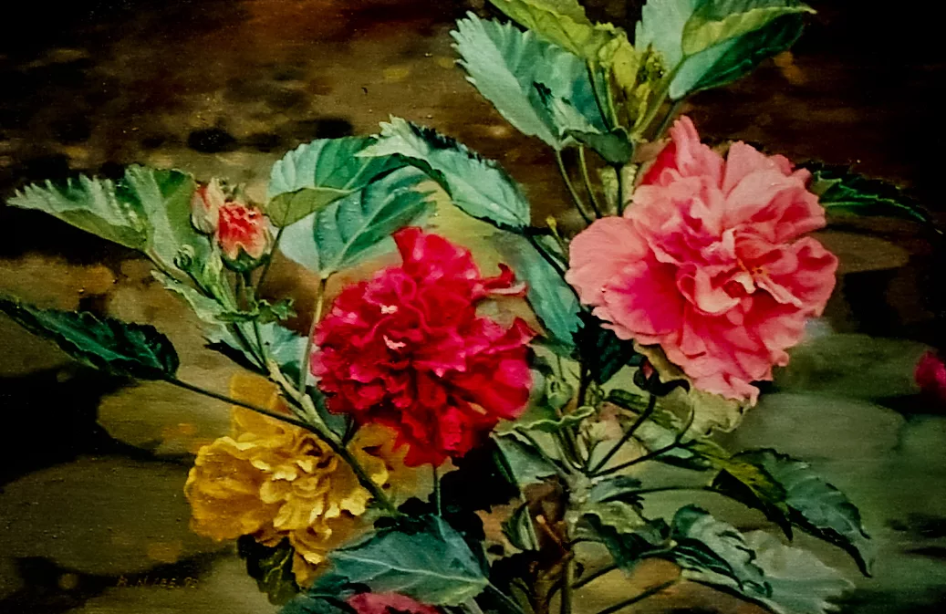 Lee Boon Ngan is known for her realistic flower paintings in oil. Despite close connections to prominent artists – her brother Lee Boon Wang (1934–2016) and husband Chua Mia Tee (1931–), both founding members of the Equator Art Society – her own artistic development began formally only in her twenties. Growing up in an immigrant Chinese-Teochew family as the only daughter, Lee spent her youth primarily in domestic roles and as a model for both artists. She appeared in numerous works including Chua’s National Language Class (1959), serving as a quiet observer and companion to their artistic activities.