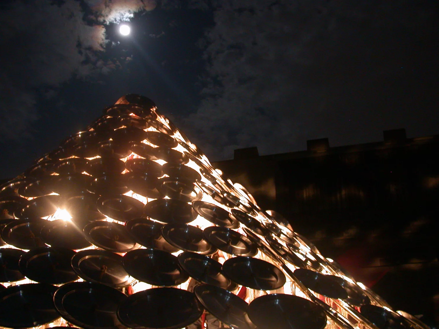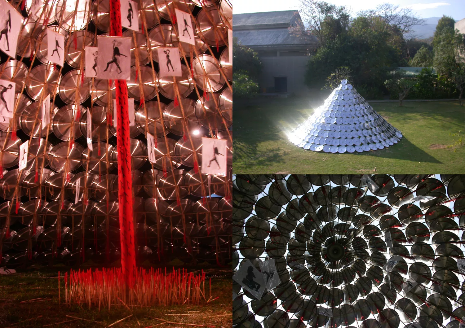 L. H. Ly is the first woman artist in Vietnam to work in a sustained and committed way in the medium of performance art, and one of only a few women artists in the 1990s and 2000s, in the whole of Vietnam, to make audacious and bold statements through their art, often speaking to issues of women’s bodies, sexuality and gender equality. In Monument of Round Trays (various iterations, 2001–2010), the artist created a towering pyramid constructed from the aluminium serving trays traditionally used by wives and mothers to serve food to family members and guests. Four metres high and eight metres wide, the structure resembled a metallic mountain with reflective surfaces that, due to its elastic armature, would sway and tremble according to weather conditions. When a viewer entered the monument they would see, within its interior, hundreds of hanging black-and-white photographs of nude women, and human figures expressing gestures of freedom and liberation painted on the underside of the trays. Ly thus presented a tension between the different kinds of burdens women continue to bear as figures of domesticity and of sexual desire in the era of modernisation and liberalisation in Vietnam. Yet the most powerful animating force for the work was an accompanying performance where L. H. Ly marched furiously around the monument, clanging and clattering due to the trays strapped to and obscuring her body, ultimately entering the structure to try to destroy it from within.
