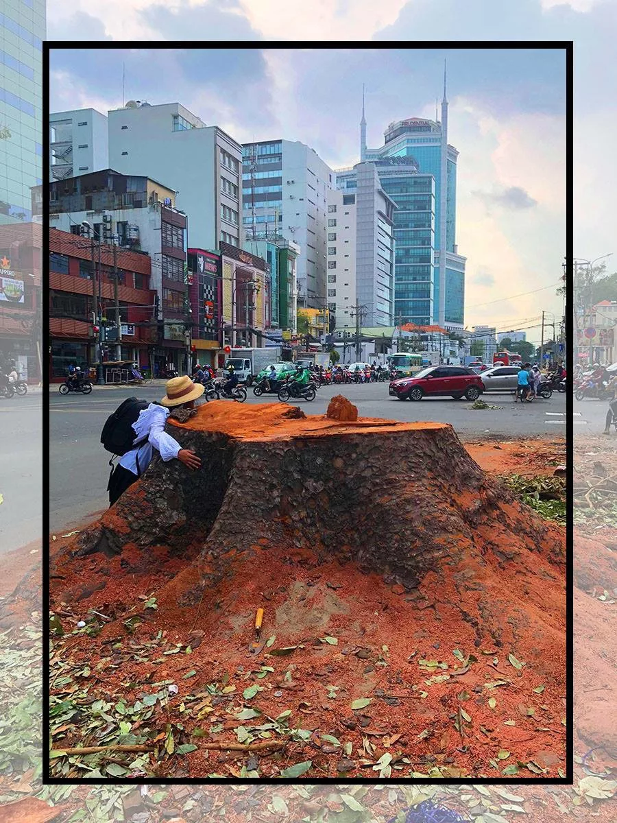 Since 2011, L. H. Ly’s work has begun to focus more on such topics as migration, displacement, community, memory and ecological loss. In the forms of an artist book (2012–2013), two sculptural iterations (2016) and a monumental work of public art (2017), Boat Home Boat conjoins forms signifying water, house and boat together with fragments of text to evoke overlapping symbols of home and journey. Alongside her sculptural work, L. H. Ly remains committed to developing her performance practice, situating the body and artistic objects as mutually activating within socially engaged projects. In response to the news that masses of trees would be cut down in Hanoi and Saigon, the artist enacted participatory durational performances with public installations and documentary films from 2015–2018 that drew on Buddhist practices of mindfulness, such as Hugging trees – Hugging your loved ones – Hugging yourself (2015 and 2016).