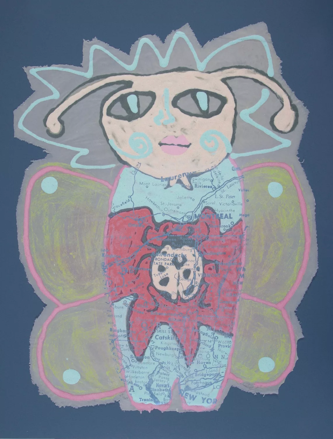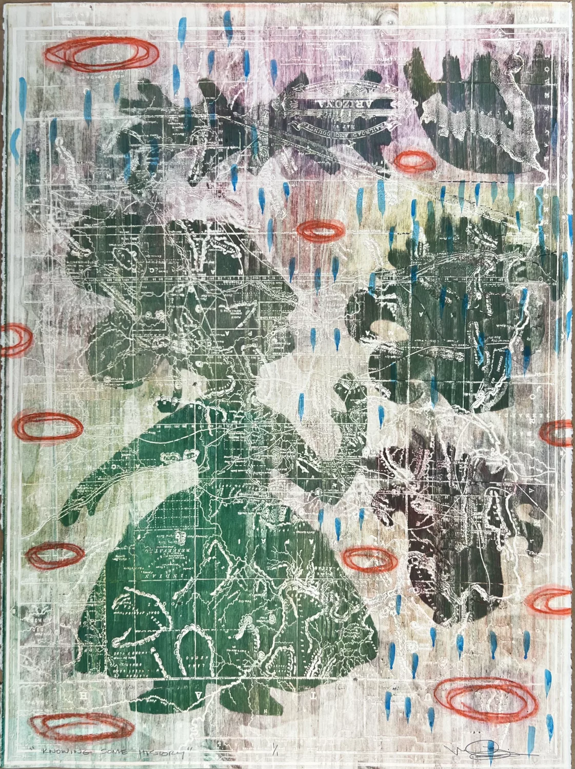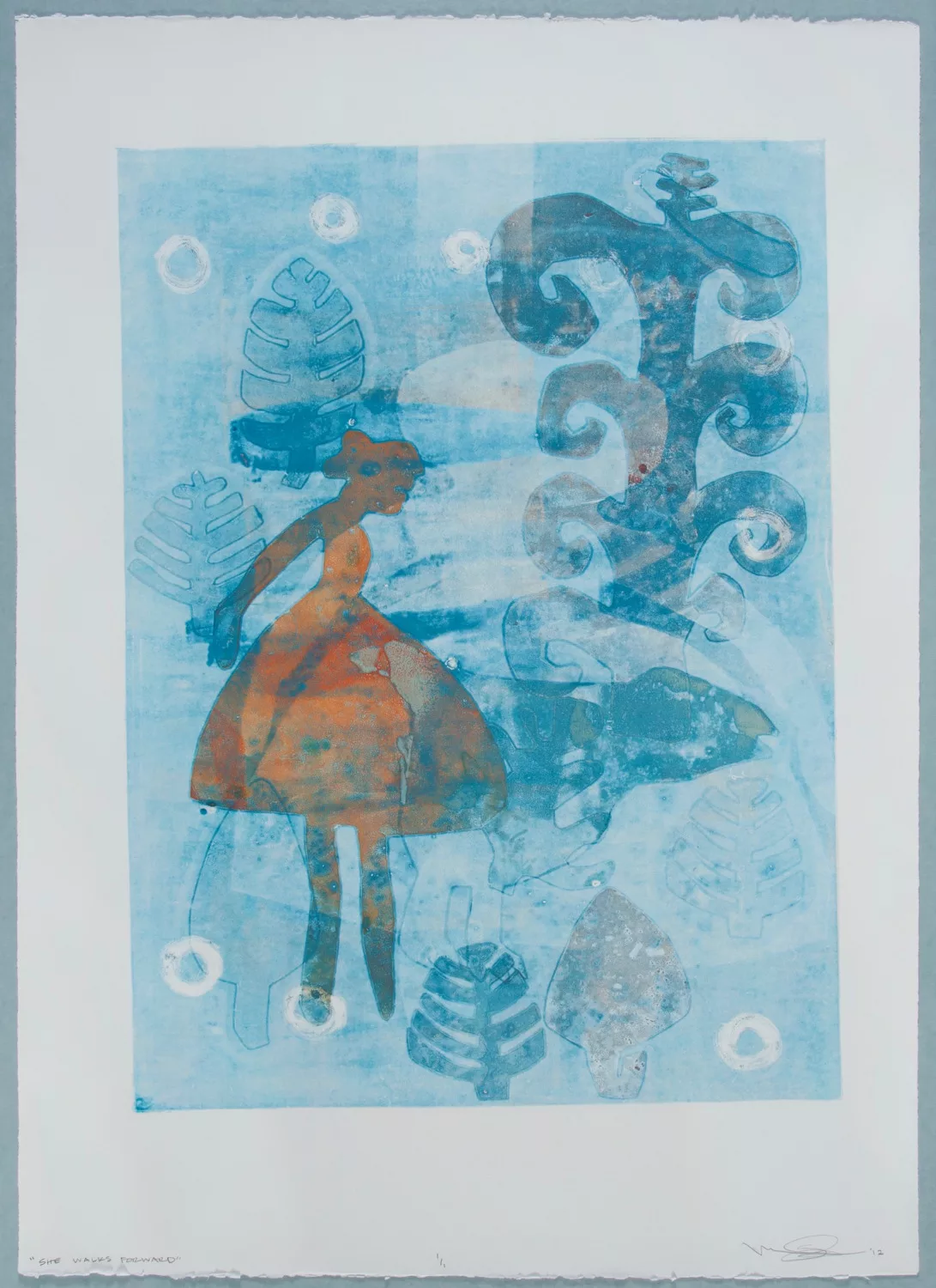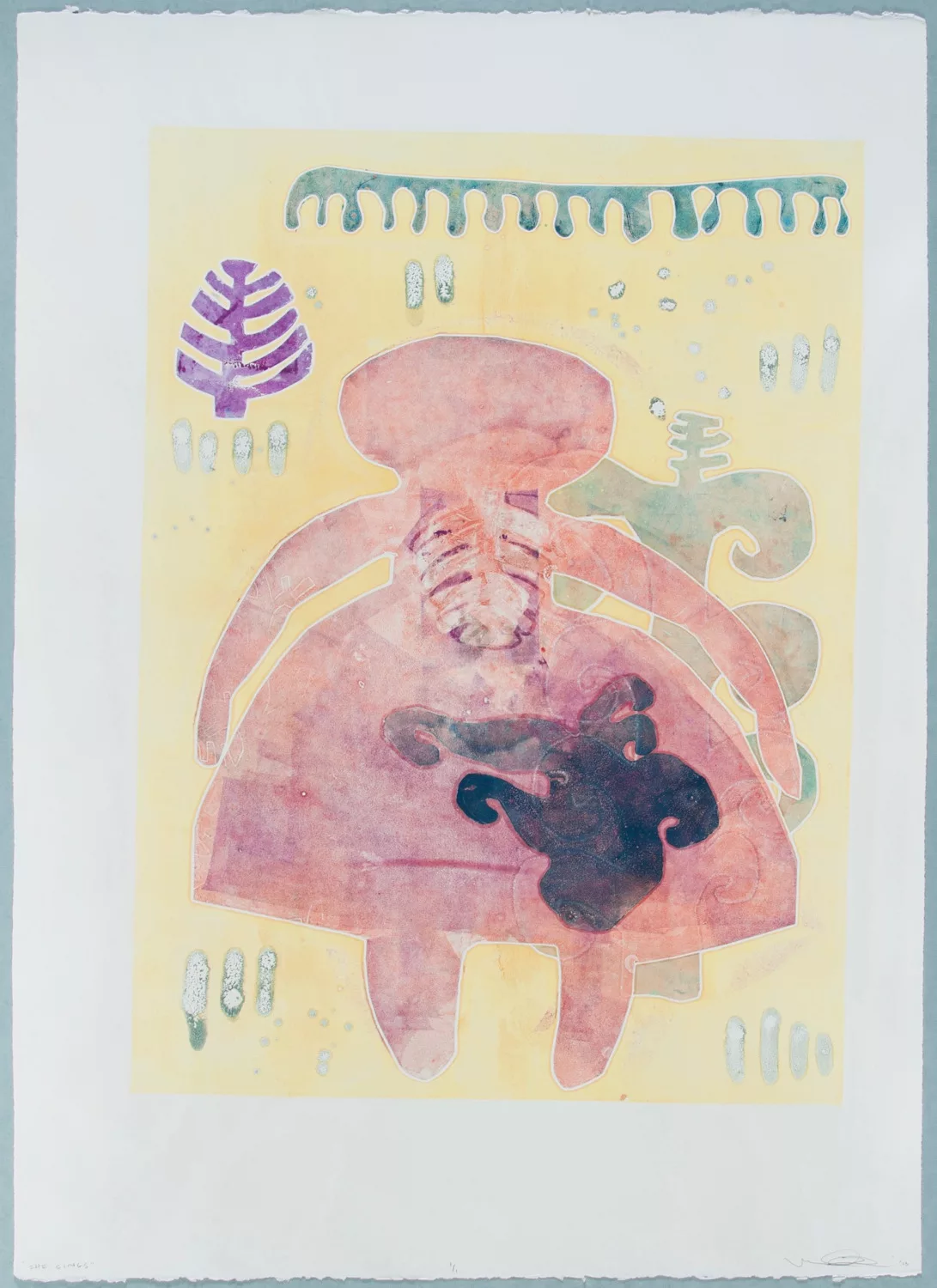 While M. Yazzie has worked in a variety of mediums, she is best known for her printmaking works. Her monotypes are layered with stencils of cultural, geographic, autobiographical references and vibrant colours. She takes inspiration from Diné weavings and Indigenous petroglyphs. Early in her career, her works were often overtly political and explored the aftermath of colonisation on Indigenous peoples and how this history shapes personal identities. Such works include The U.S. Government Will Never Whitewash My Grandparents (1992) and Indian Look-Alike (1993). In Indian Look-Alike, M. Yazzie inserts one of her own childhood photos within an elementary school worksheet to demonstrate an example of contemporary Native Americans. By doing so, she disrupts the dominant culture’s constant urge to relegate Native Americans to being people who existed only in the past. By the early 2000s, M. Yazzie was taking a lighter approach to her compositions, creating artworks that were less political and more abstract. Works like the Metamorphosis Series (2000–2003) and She Walks Forward (2012) may appear more playful than her earlier works but are still brimming with Indigenous symbolism and the artist’s own understanding of herself. M. Yazzie’s depictions of human beings, primarily Diné women, became abstract and silhouetted. Additionally, she began to focus attention on the lives of insects and plant life. Ultimately, her artworks strive to spark joy but also to inspire non-Indigenous people to listen and learn from Indigenous peoples’ experiences.