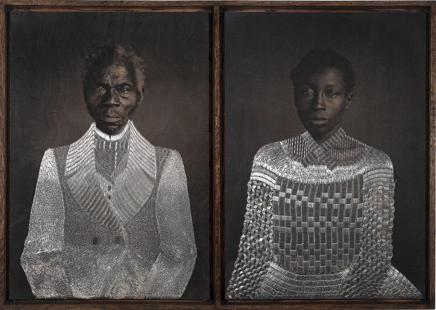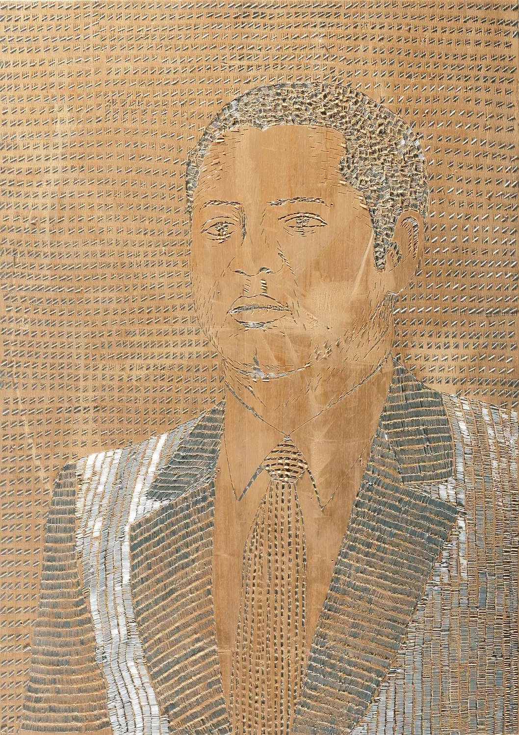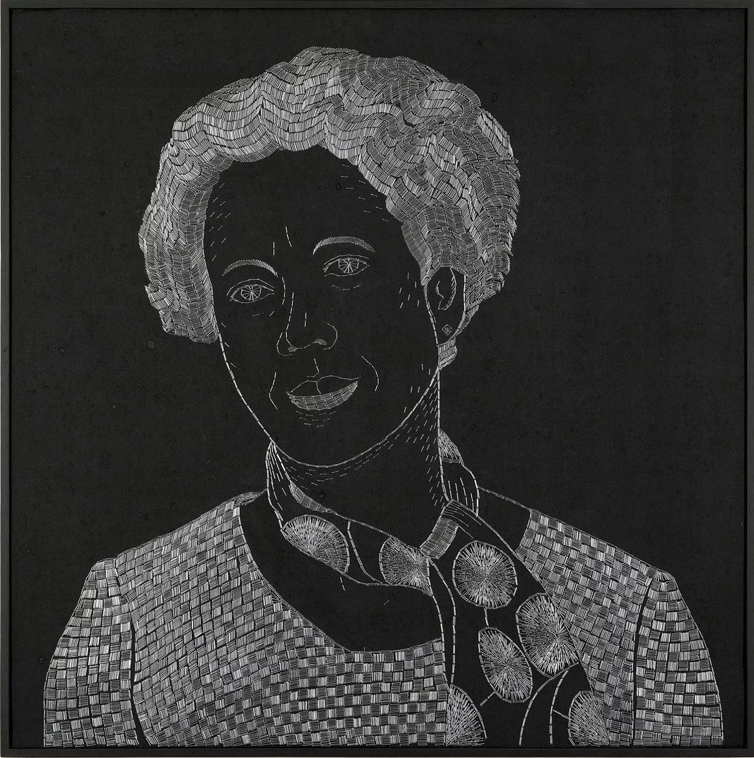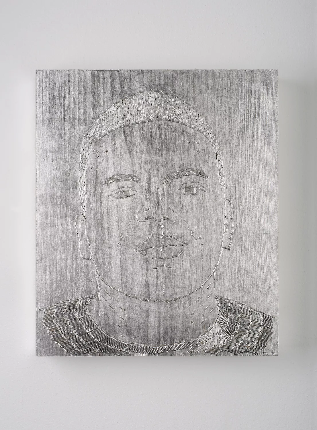 S. Huber’s artistic gesture is distinguished by her use of the air-pressured staple gun, which she wields both as a plastic tool and as a symbol of pain and healing. The series Shooting Back – Reflections on Haitian Roots (2004) is emblematic of this approach. The artist portrays Christopher Columbus and dictators François and Jean-Claude Duvalier – figures whose actions shaped Haiti’s social and political history. Through the sonic and visual repetition of the “tak-tak-tak” of the stapler, S. Huber makes audible a cadence of violence, where each impact becomes a mark, a rhythm and a perforated trace. With the series Shooting Stars, begun in 2014, she continues ‘shooting portraits’ with the aim of assembling a gallery of historically and geographically separated individuals whose sacrificed lives she honours.
