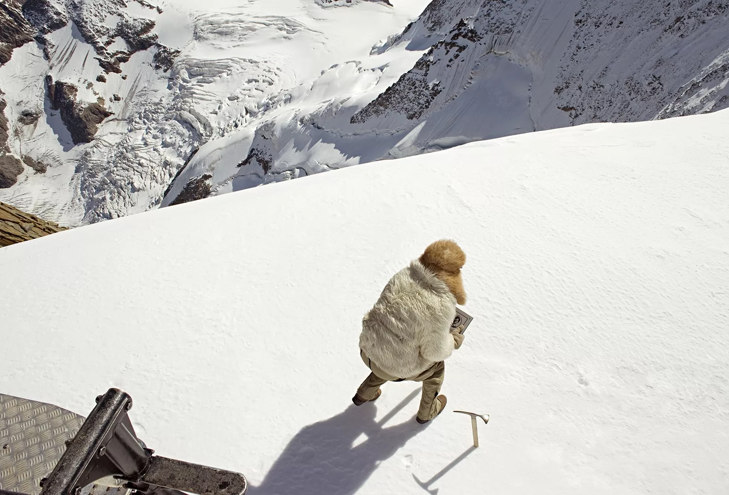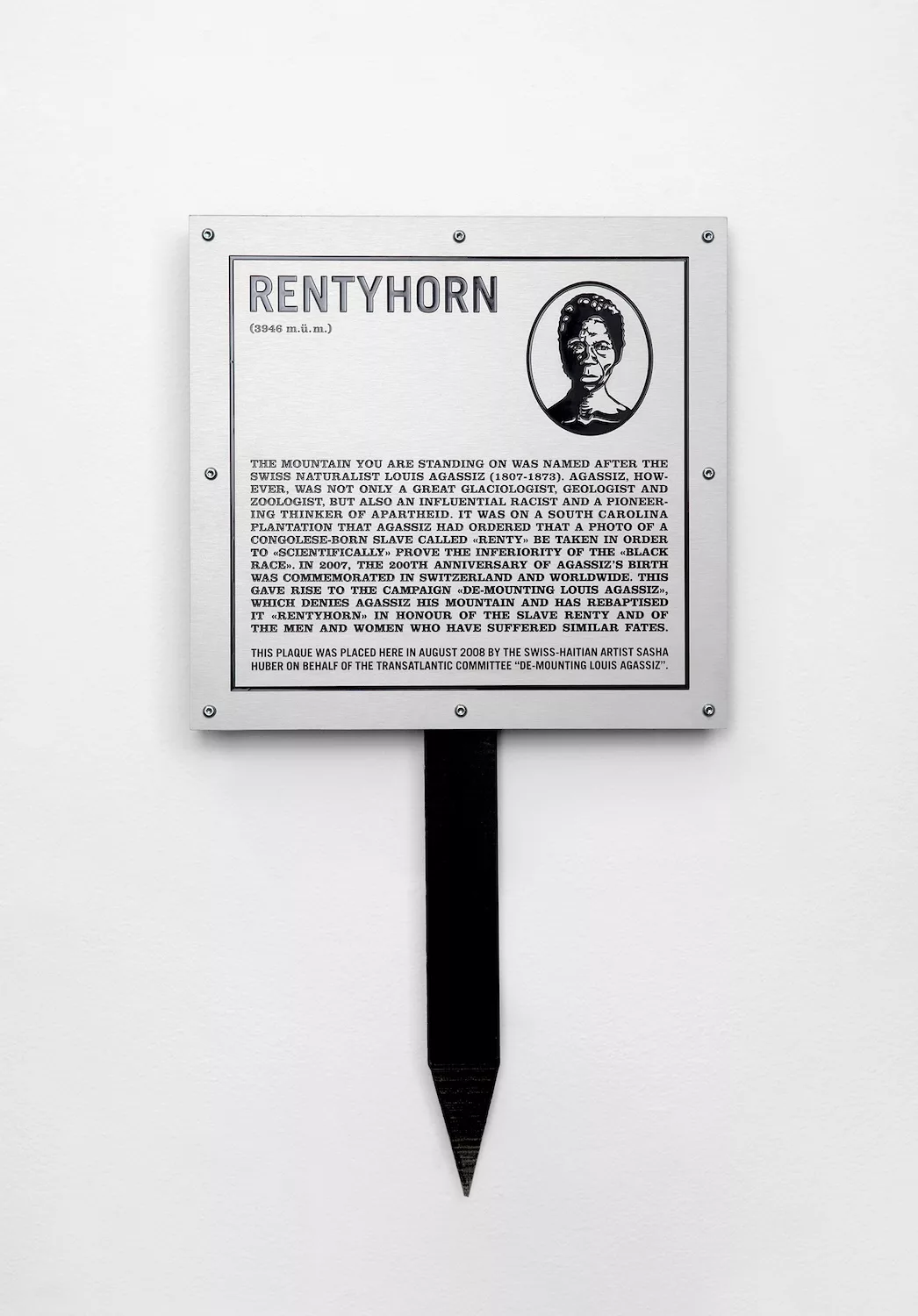 Since 2007 she has taken part as a committee member in the ‘Demounting Louis Agassiz’ campaign founded by Swiss historian Hans Fässler, advocating for the renaming of the Agassizhorn, a mountain named after the Swiss glaciologist and theorist of biological racism. The peak was symbolically renamed Rentyhorn in tribute to Renty, a Congolese man enslaved in the United States, whose portrait was part of a series commissioned by Agassiz for racial taxonomy. With the self-portrait series Agassiz: The Mixed Traces (2010 – 2023) and the video Louis Who? What you should know about Louis Agassiz (2010), made in Rio de Janeiro, the artist reterritorialises spaces marked by colonial toponymy, engaging and collaborating with local Indigenous peoples. Similarly, in the series Tailoring Freedom (2021-23), S. Huber printed on wood the portraits of enslaved people photographed on Agassiz’s commission, dressing them with staples inspired by the garments of abolitionists such as Harriet Tubman and Frederick Douglass.