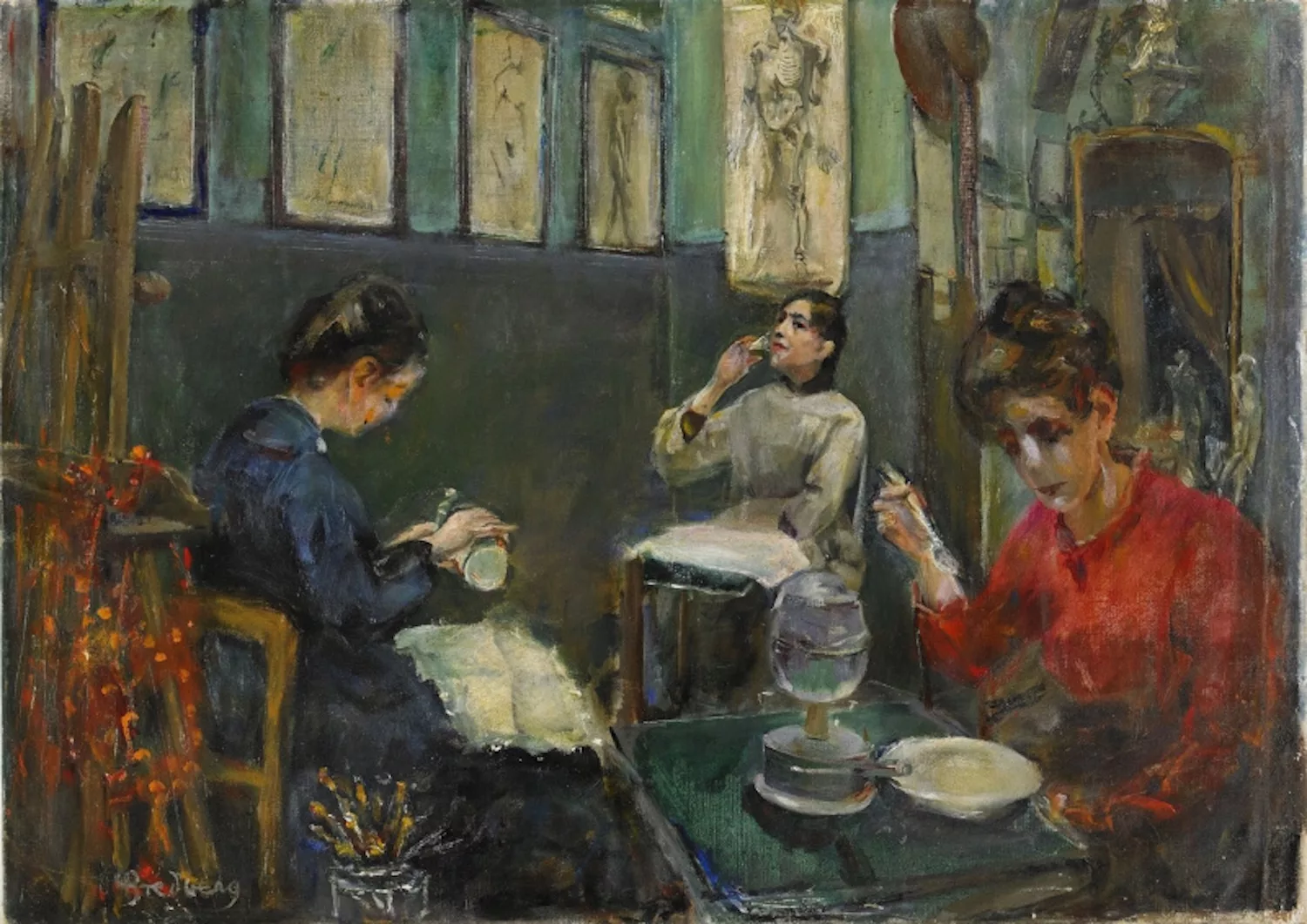 She soon found her place in the art world there, sharing a studio with artists such as Anna Bilińska (1854–1893) and Amélie Beaury-Saurel (1849–1924). M. Carlson-Bredberg captured this creative and competitive milieu in paintings (Académie Julian with Mademoiselle Beson drinking, 1884), sketches and drawings (Atelier Julian, 1884). She won the Académie Julian’s silver-medal for Têtes peintes et dessinées in 1885.