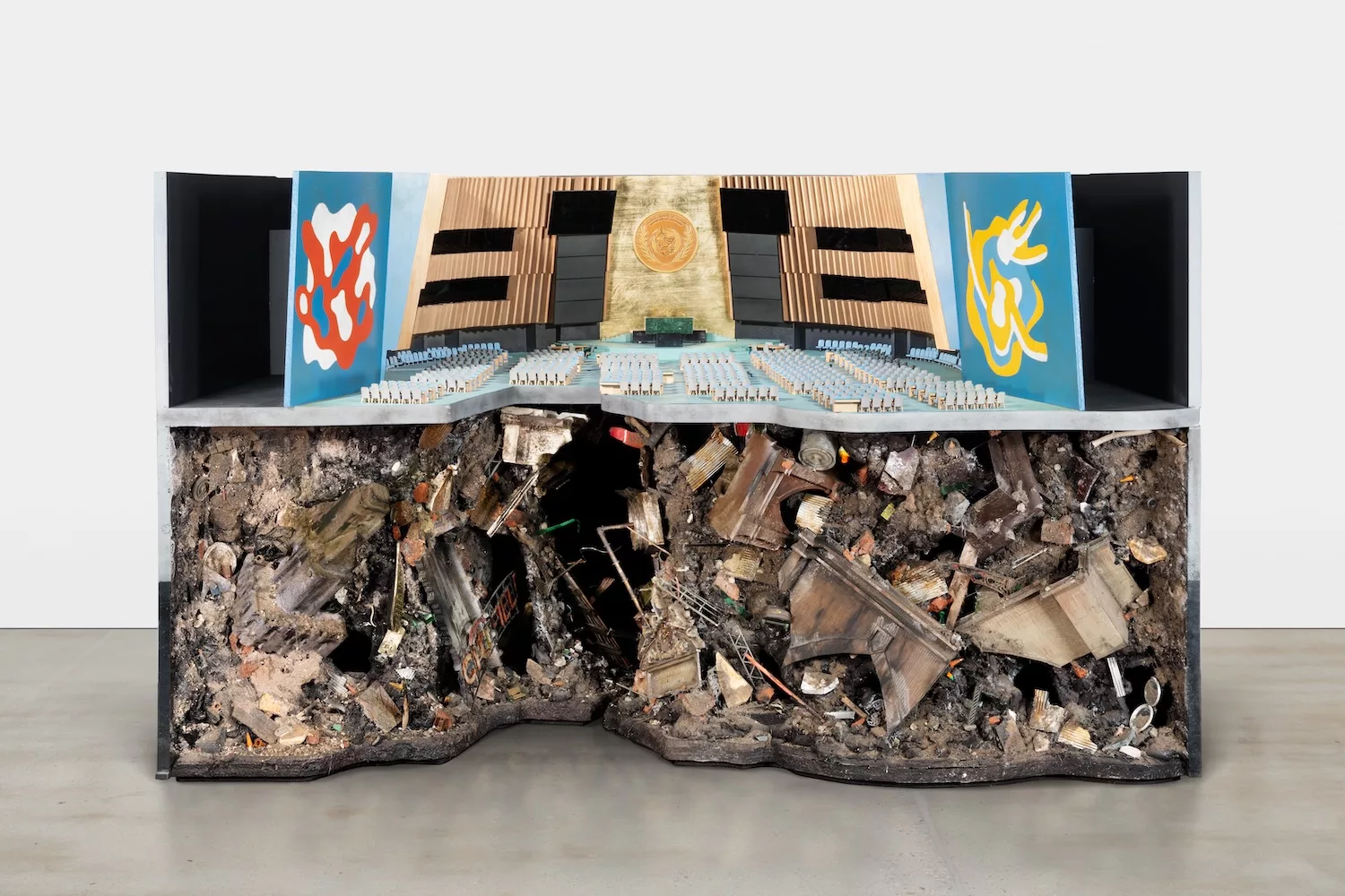 Cécile B. Evans, Ad Hoc Order (Your collapse was witnessed, your destruction cataloged and banked at the wreckage of the hope meant to heal you. Every fibre will be used to knit a duvet.), 2024, acrylic, laser cut acrylic, plywood, poplar wood with dye stain, steel rod, foamboard, foam, acrylic paint, enamel paint, 3D printed nylon, ABS, PLA, and acrylic resin, concrete, stone, marble, dirt, archival ink, found objects, 49.7 x 39.7 x 40.4 in [126.2 x 100.9 x 102.6 cm], © Photo: Rosy Warren