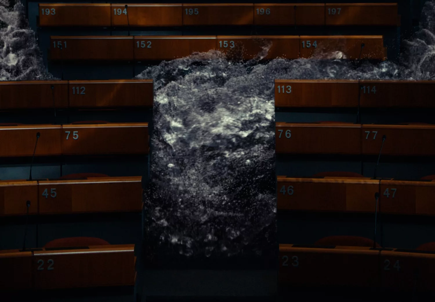 C. B. Evans’s most recent works continue to address the entanglement of affect, memory and systems of power. The videos RECEPTION! (2024), a special commission by Miu Miu, and MEMORY! (2025) were presented as part of an installation at the Sharjah Biennial 16, alongside the sculpture Ad Hoc Order (2025), a scale model of the UN General Assembly Hall, split open into five pieces and sitting atop a subterranean mass consisting of the ruins of New York City. Set against the backdrop of ecological collapse and the mass erasure of personal data, the video works follow the character ‘Reception’, played by the French actress Guslagie Malanda, one of the last human translators, who transcribes the remaining fragments of memory.