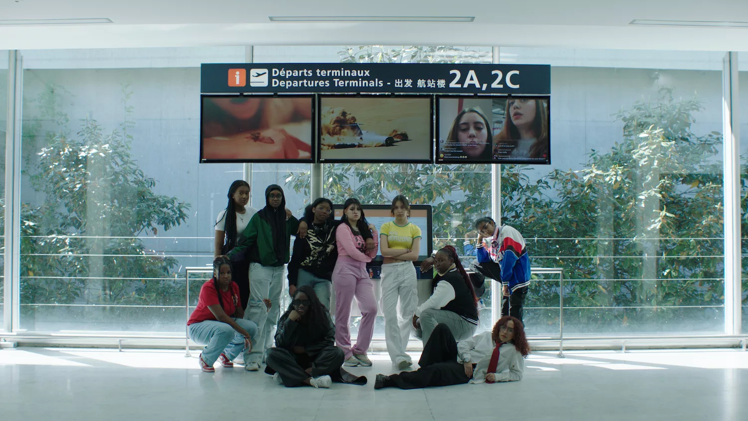In their more recent video and installation work Reality or Not (2023) C. B. Evans returns to a diverse constellation of references, mobilising the genre of reality TV to explore how reality is constructed. The work interlaces different characters including a ‘narrator’ — played by Alexandra Stewart, the English-language voice of Chris Marker’s Sans Soleil (1983), embodying institutional authority — with a group of real high school students from C. B. Evans’s neighbourhood in Saint-Denis. The group, self-named collective ‘Realitarians’, participate in a reality TV programme that prompts them to question dominant constructions of reality and imagine other alternatives.