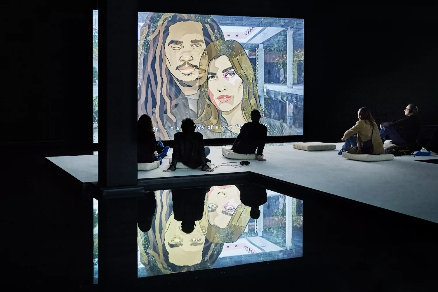 First presented in an early iteration at the Musée d’Art Moderne de la Ville de Paris and later reconfigured as an installation for the 9th Berlin Biennale, What the Heart Wants (2016) expands on this visual language. The work manifests as a large video projection set within a flooded exhibition space, and preceded by sculptural constellations of LCD screens and holocubes mounted on sweating plexiglass stands. It speculates on what it might mean to be human in the future, centring on HYPER — an omnipresent system that has achieved personhood — who enters into dialogue with a constellation of protagonists, together reflecting on the conditions of humanity.