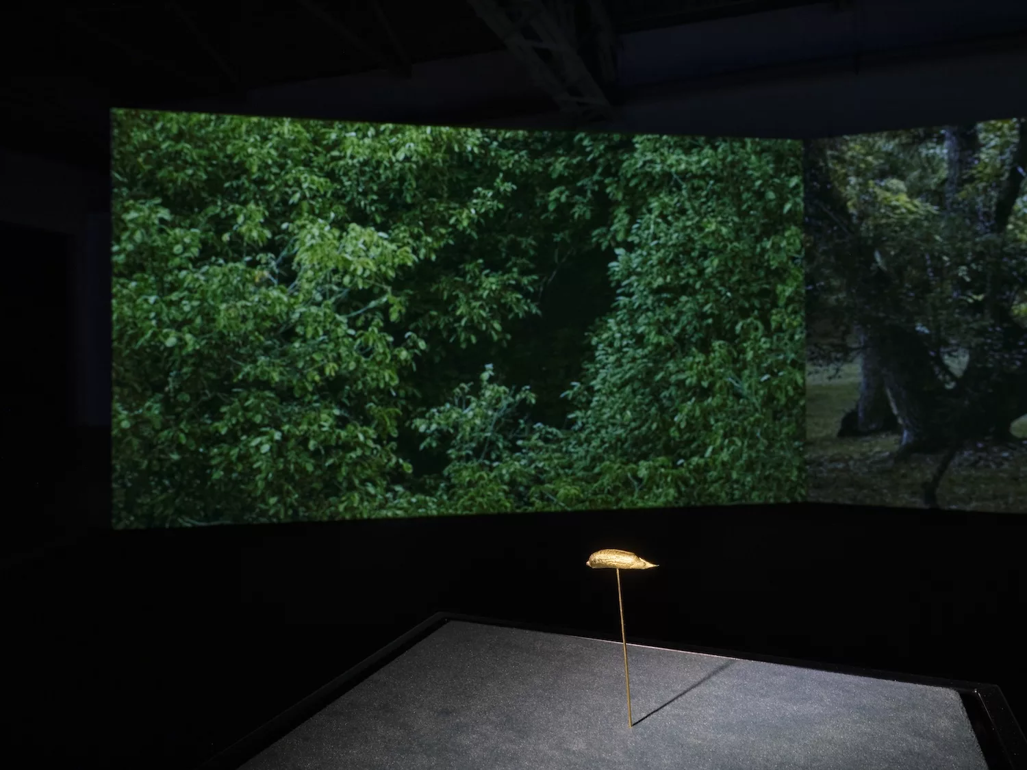A telling example of the artist’s approach appears in a recent sequence of works devoted to the Arslanbob forest located in present-day Kyrgyzstan. Long venerated as a sacred site by Central Asian communities – whose belief systems connect it to episodes ranging from antiquity to modern history – the world’s largest natural walnut forest also functions today as an economic resource, with its harvest integrated into regional trade networks. Arslanbob’s dense semantic, mnemonic and historical strata provide S. Ismailova with a fertile terrain for artistic inquiry. Through animation, on-site filming, performance, sculpture and sound recording, she undertakes a meticulous dissection of the forest’s layered socio-political entanglements, while preserving its evaporating myths. The outcomes of this complex process unfold gradually, materialising in the works Arslanbob (2023), The Seed Under Our Tongue (2024) and Amanat (2026).