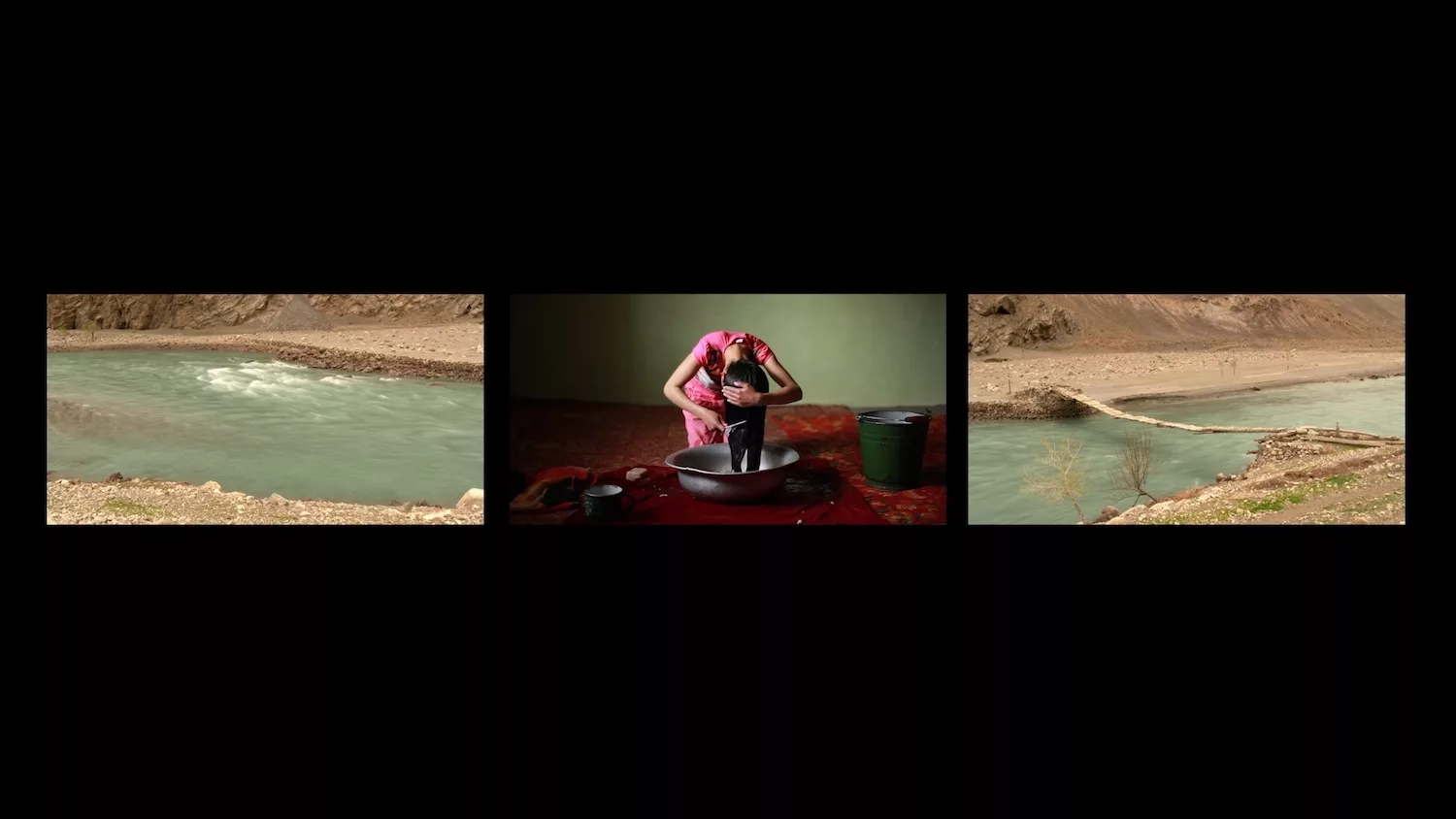 Video, the artist’s primary medium, is often approached by S. Ismailova in a cinematic manner, reflecting both her classical training in filmmaking at the Tashkent State Art Institute and the influence of her father, Abdurakhim Ismailov, a Soviet and Uzbek cinematographer. Since the mid-2010s, however, she has increasingly identified as a visual artist, a shift that has allowed her to move away from strict technical rigour in favour of greater sensuality and experiential openness. This period of her practice brought Zukhra (2013) to life and was later followed by the time spent at Le Fresnoy – Studio National des Arts Contemporains, from which she graduated in 2017, producing Stains of Oxus (2016) and Two Horizons (2017), two of the key pieces within her oeuvre. In the wake of this transition, S. Ismailova has progressively incorporated and increased the presence of other media – including textile, sound, photographic collage, spoken word, poetry, performance, glass and even gold – resulting in a multimedia body of work in which the moving image nevertheless remains central.