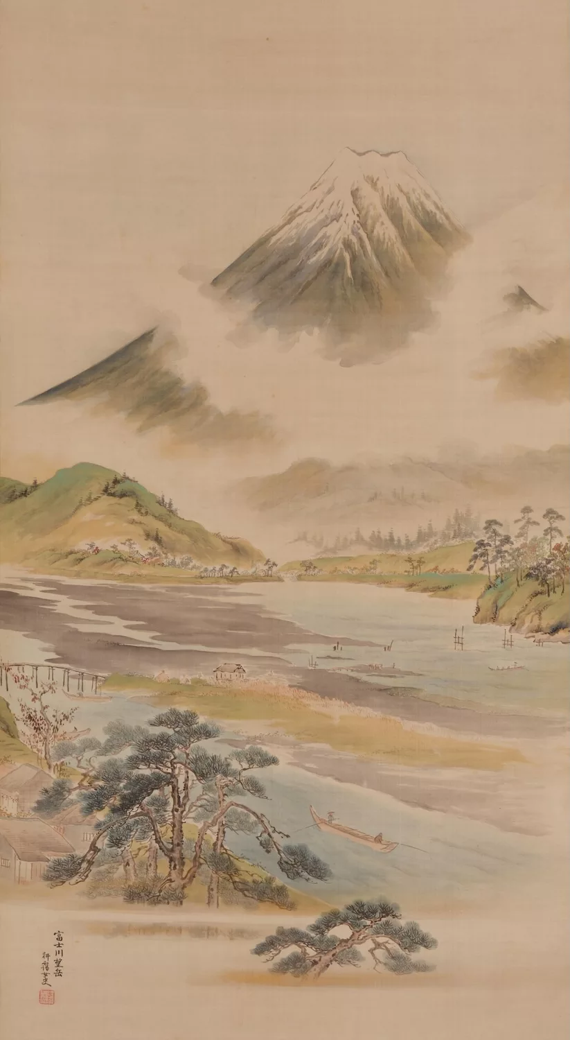 Kōai Takemura, Vue du mont Fuji depuis la rivière Fuji, 1903, peinture sur soie, rouleau suspendu, 154,5 × 85,6 cm, Musée des trésors de Sanada
