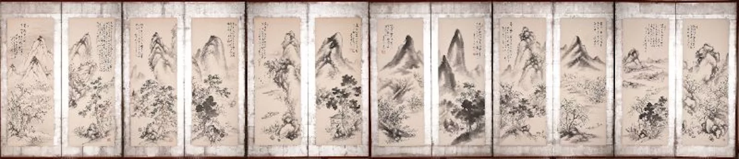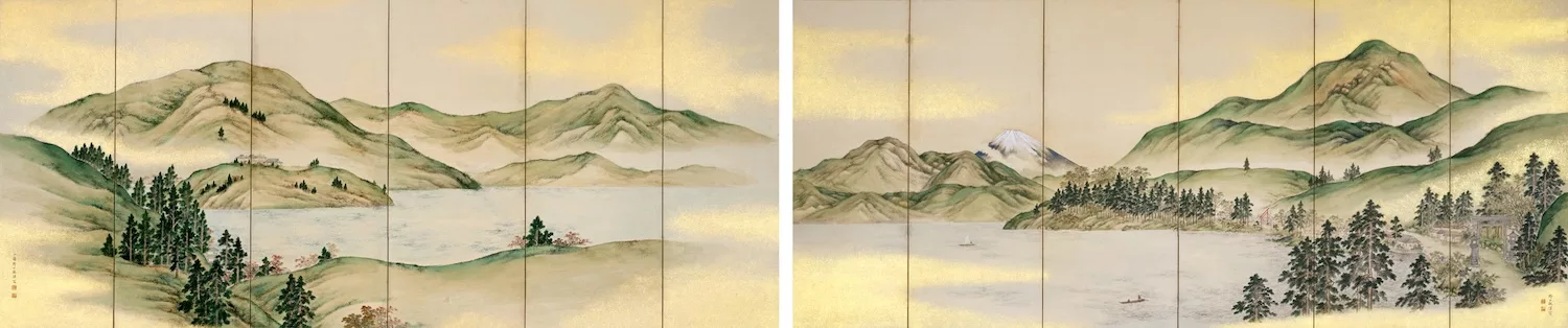 Shōhin Noguchi, Hakone Shinkeizu Byōbu [Scènes de Hakone], 1907, couleur sur papier, 128,5 × 303,1 cm chacune, Musée d’art Yamatane