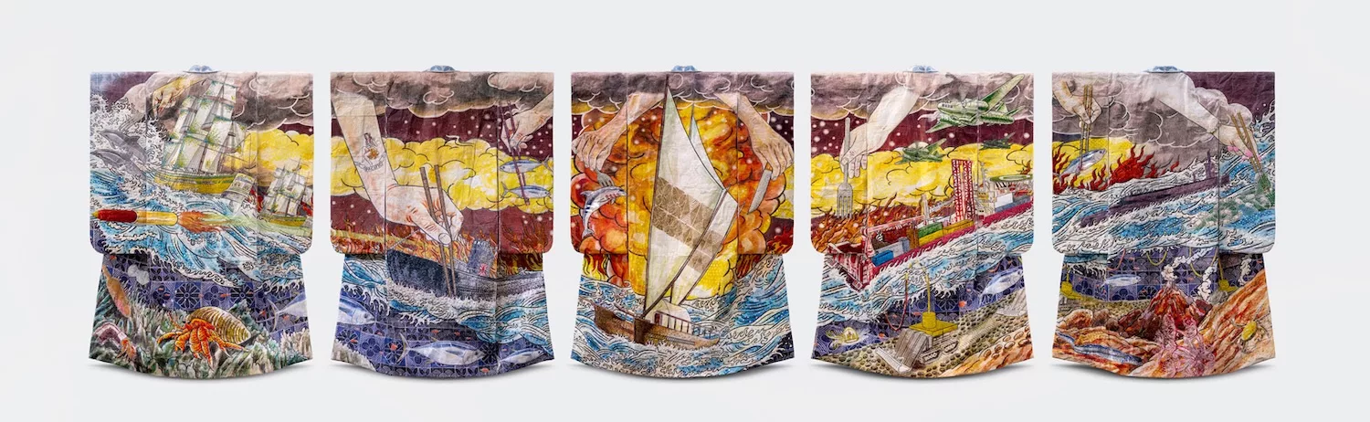 Yuki Kihara, Une chanson sur Sāmoa (Sāmoa no Uta) – Moana (Océan Pacifique), 2022, vue d’installation, Installation de 5 pièces ; siapo samoan, textiles, perles, plastique, collection privée, Naarm/Melbourne. Courtesy de Yuki Kihara et Milford Galleries, Aotearoa Nouvelle-Zélande, © Photo : Gui Taccetti
